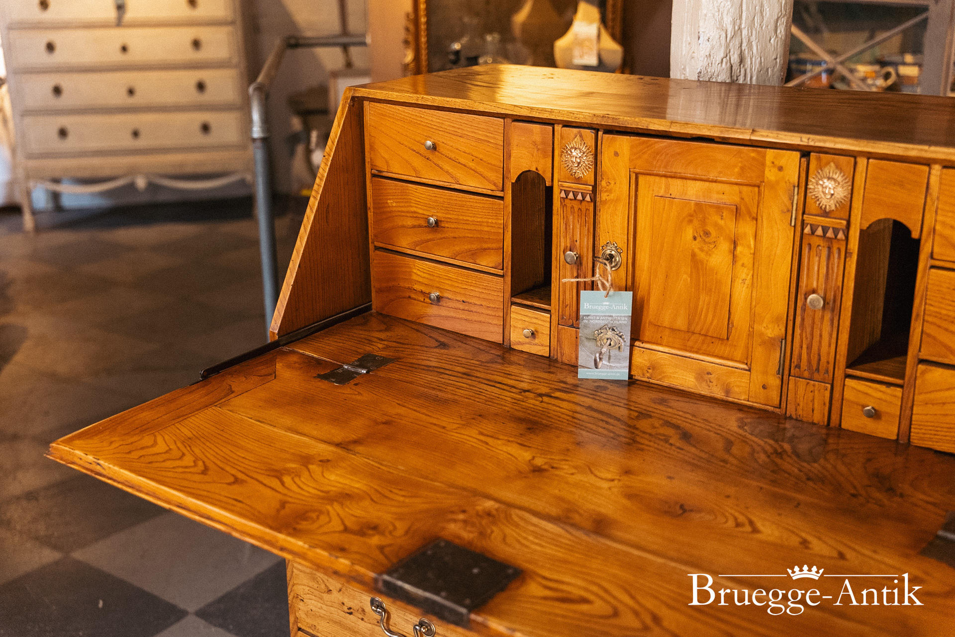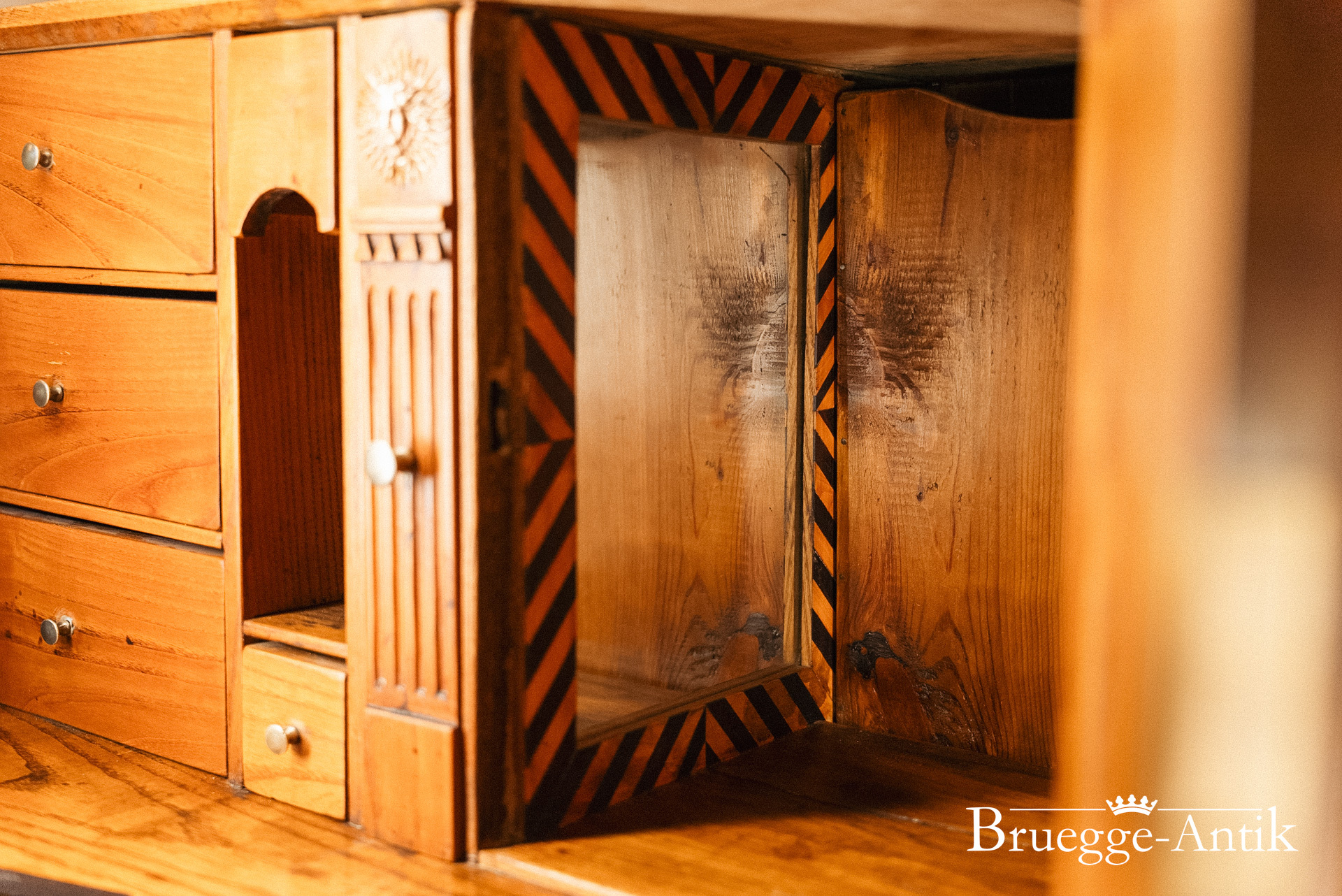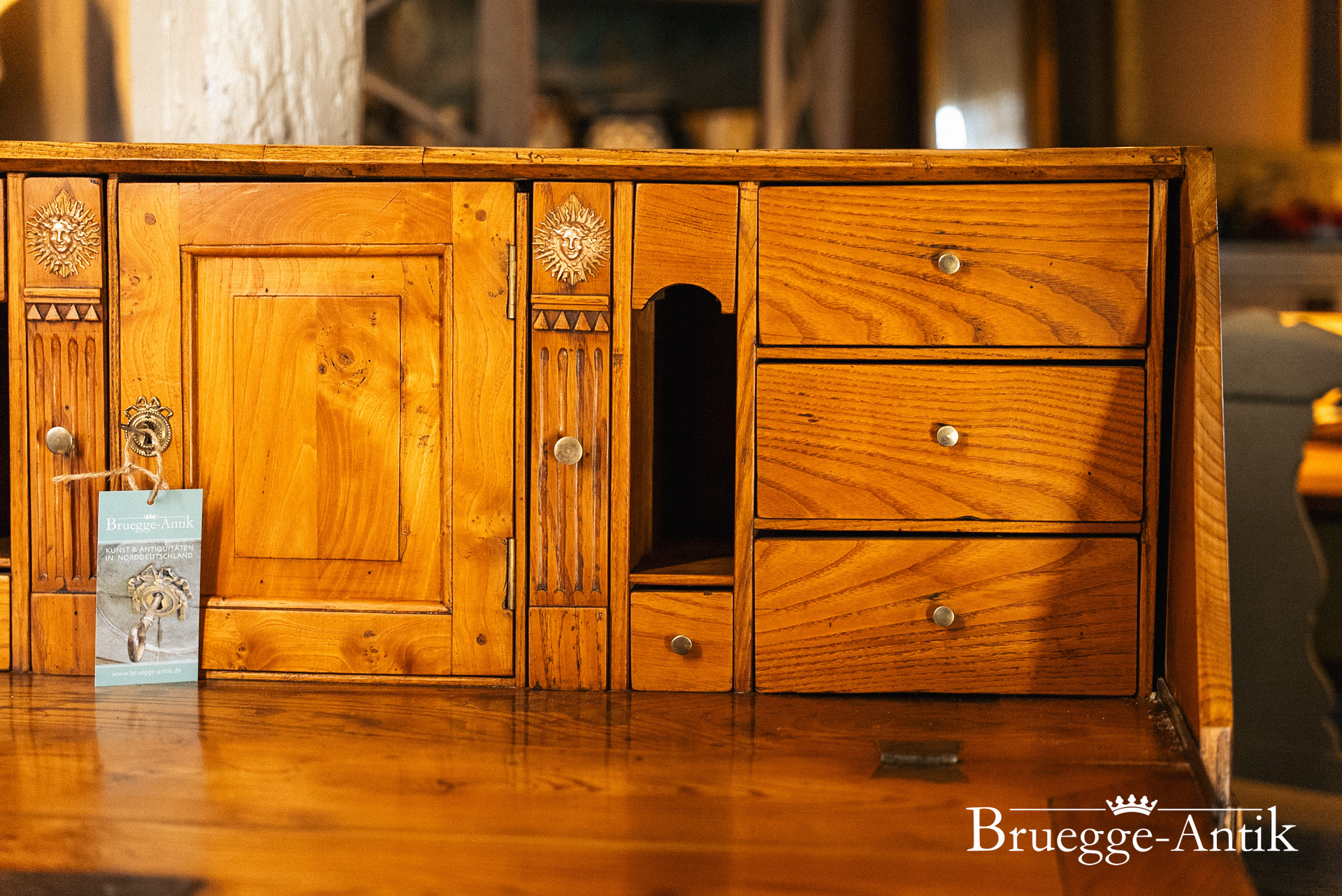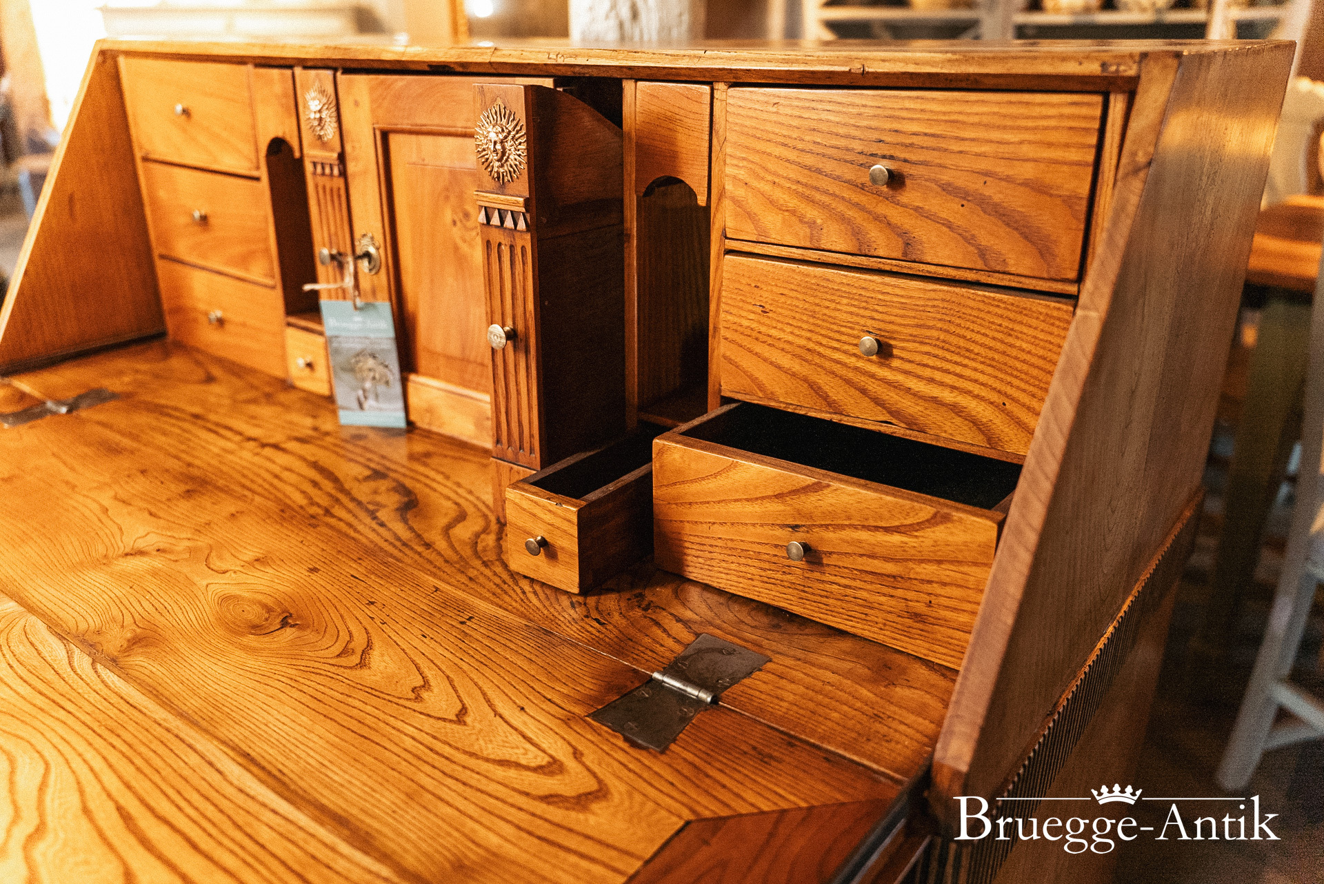 Ein Sekretär mit Extravaganzen, das verspiegelte Innere, ein Geheimfach, ein automatischer Klappenzug für die Sekretärklappe. Die besonderen Elemente einer Messingsonne und des kleinen Zahnfrieses machen das antike Möbel zu einem Unikat. Aus gut gewähltem Ulmenholz stabil gebaut und aufwändig bei uns restauriert.