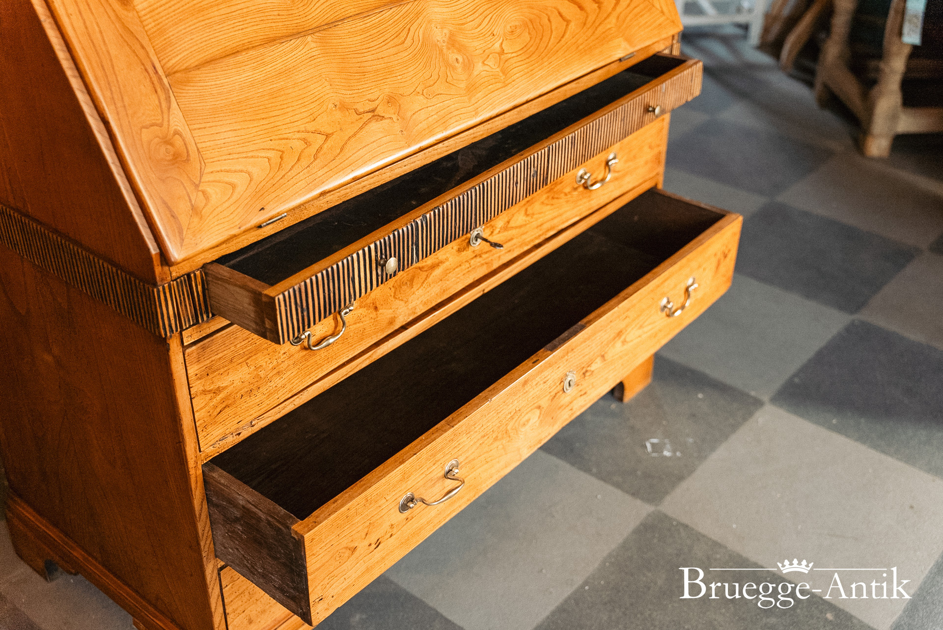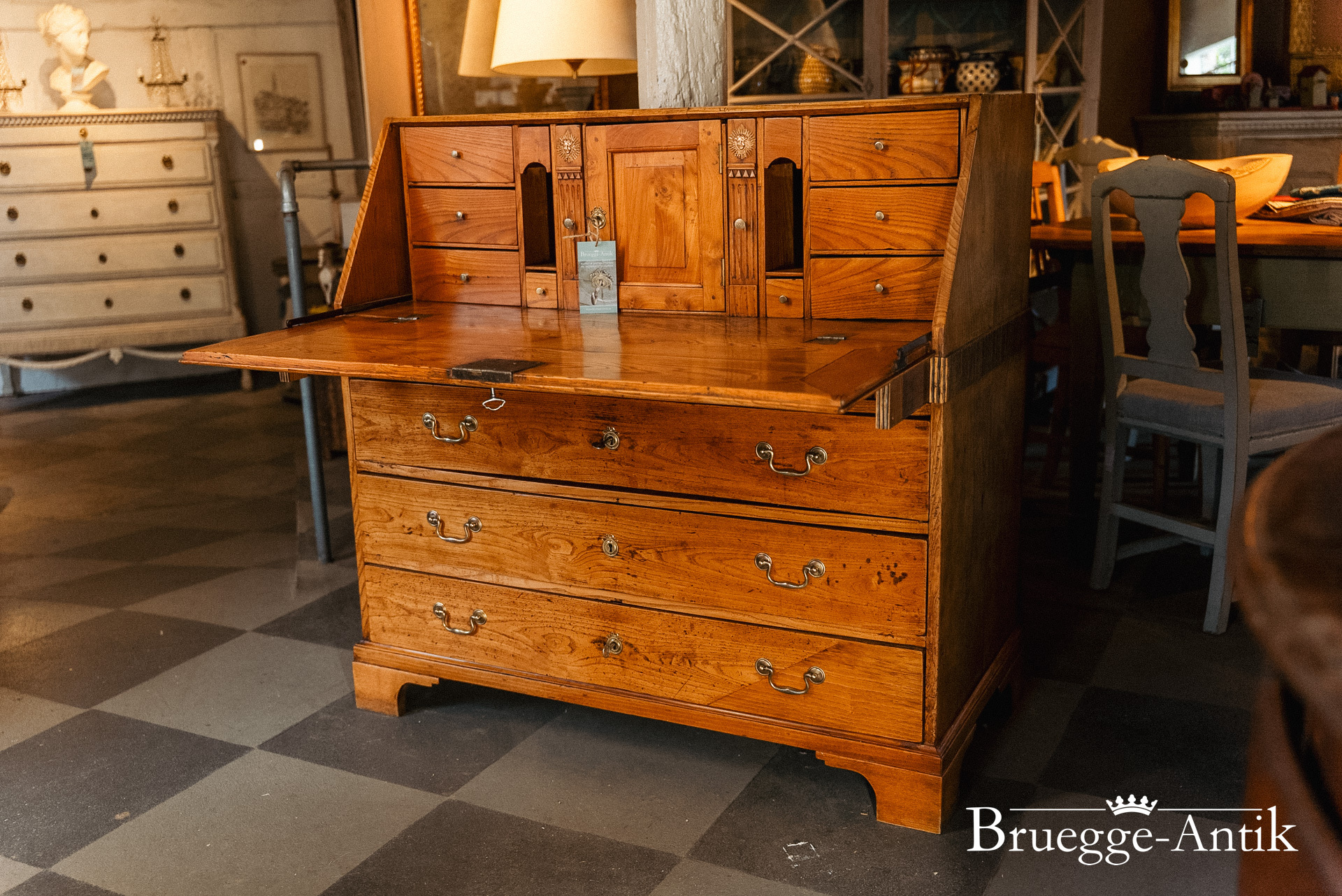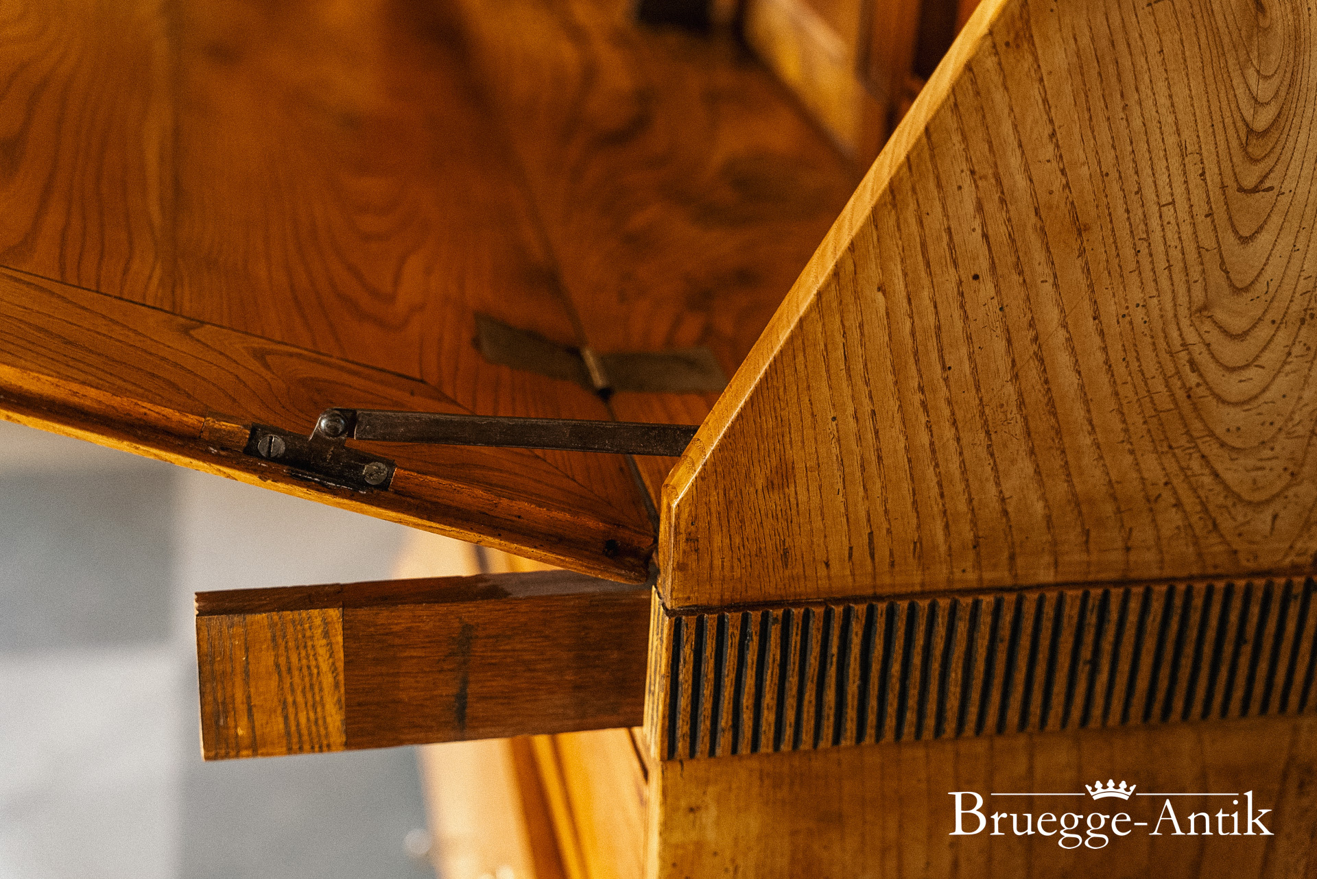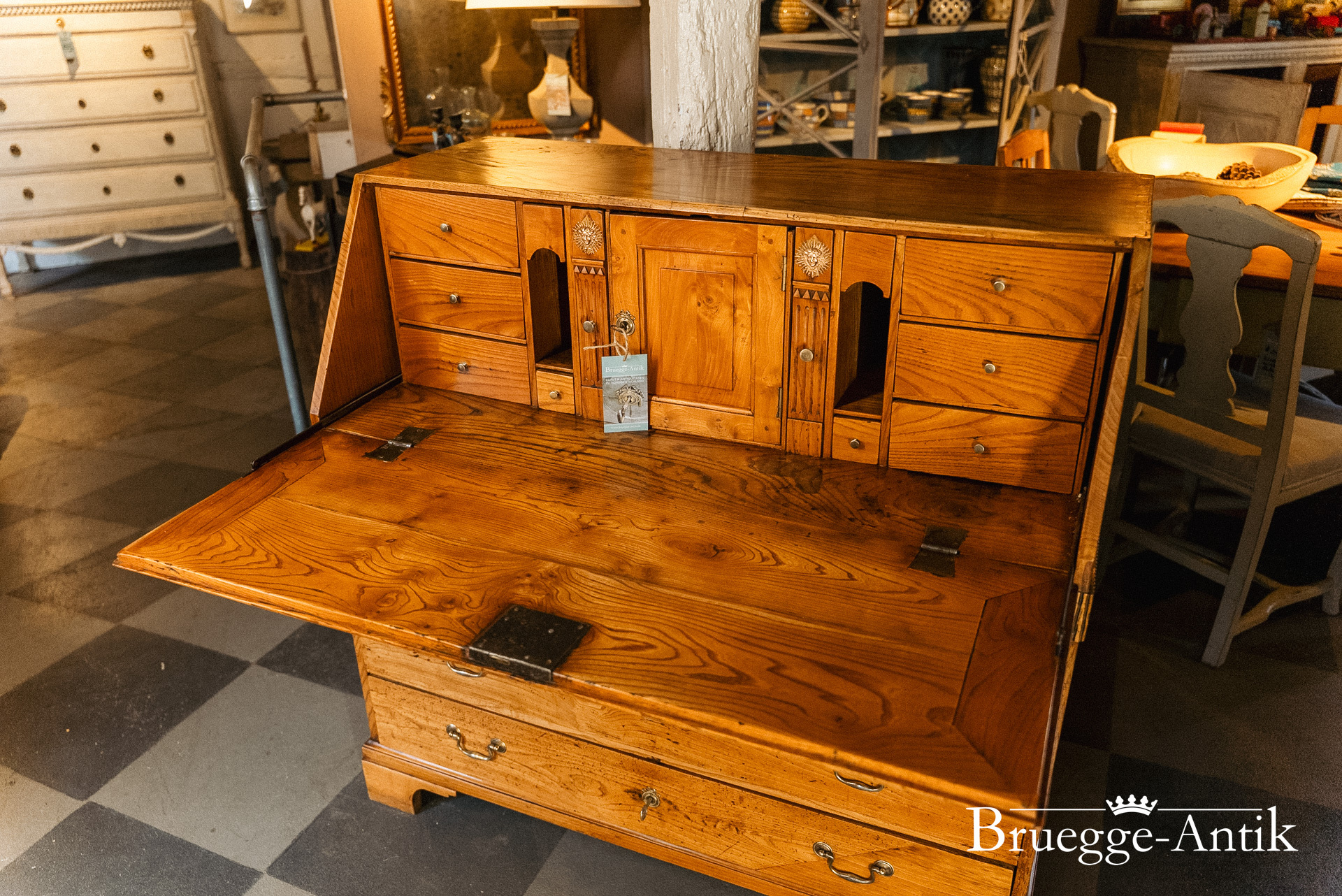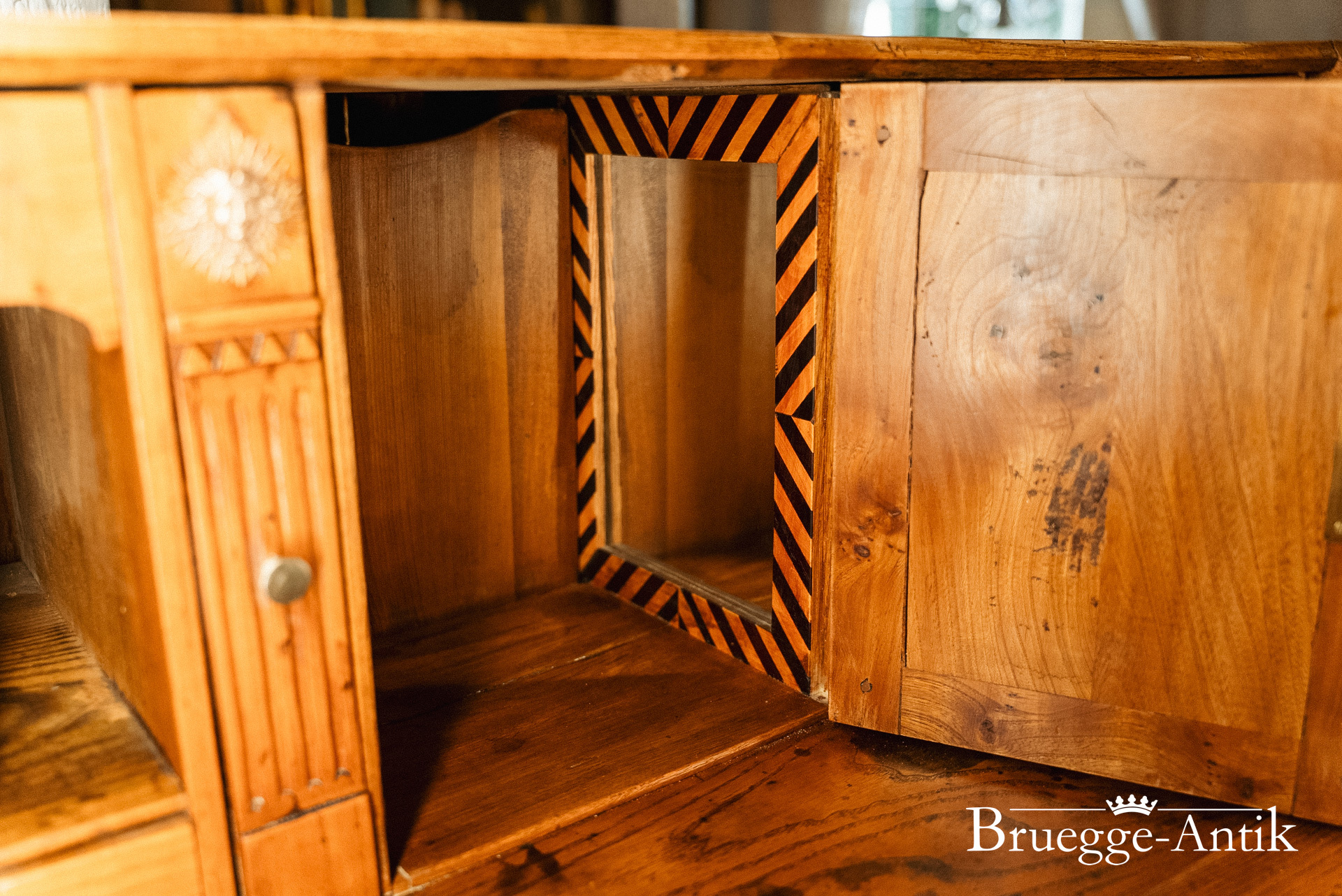 Ein Sekretär mit Extravaganzen, das verspiegelte Innere, ein Geheimfach, ein automatischer Klappenzug für die Sekretärklappe. Die besonderen Elemente einer Messingsonne und des kleinen Zahnfrieses machen das antike Möbel zu einem Unikat. Aus gut gewähltem Ulmenholz stabil gebaut und aufwändig bei uns restauriert.