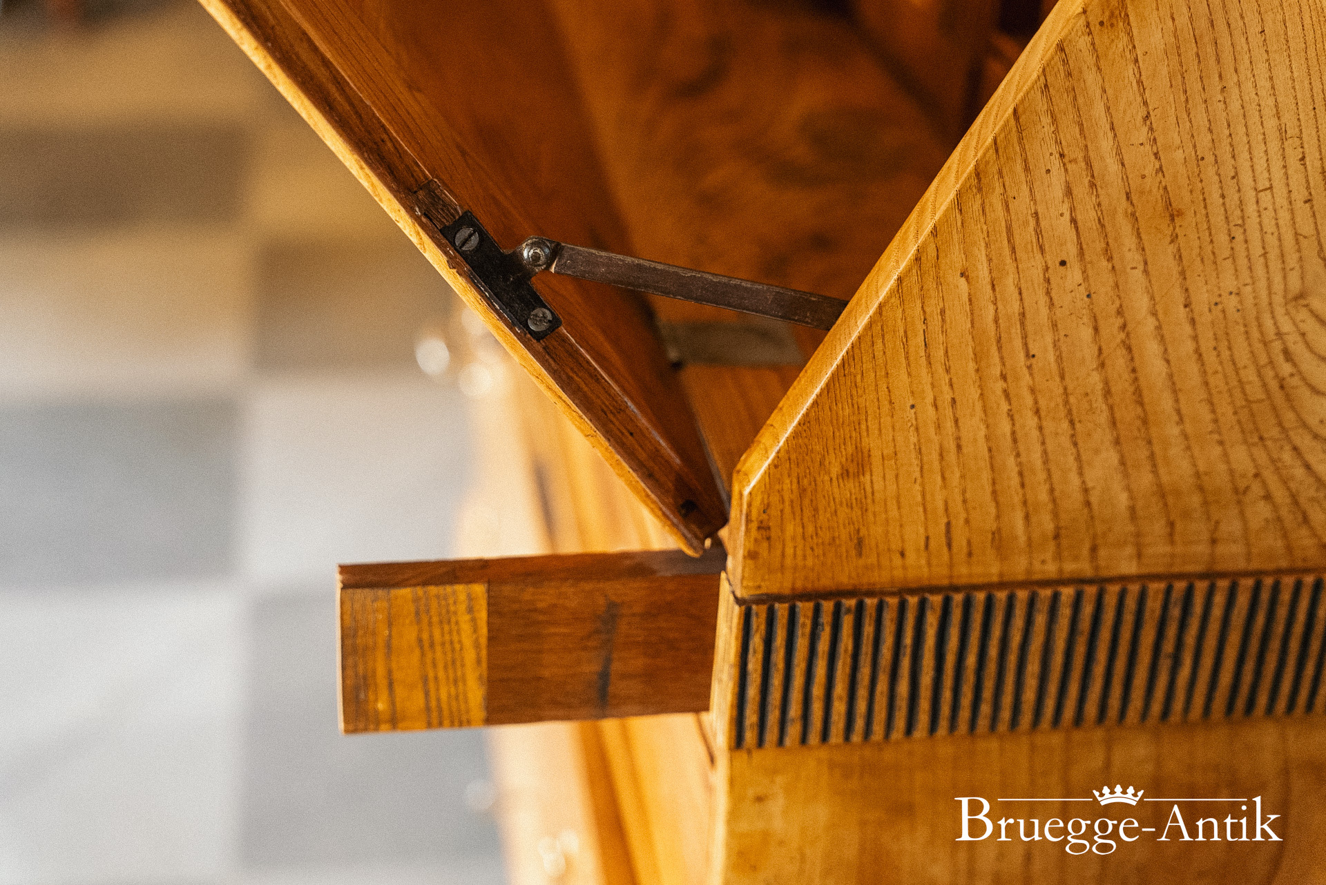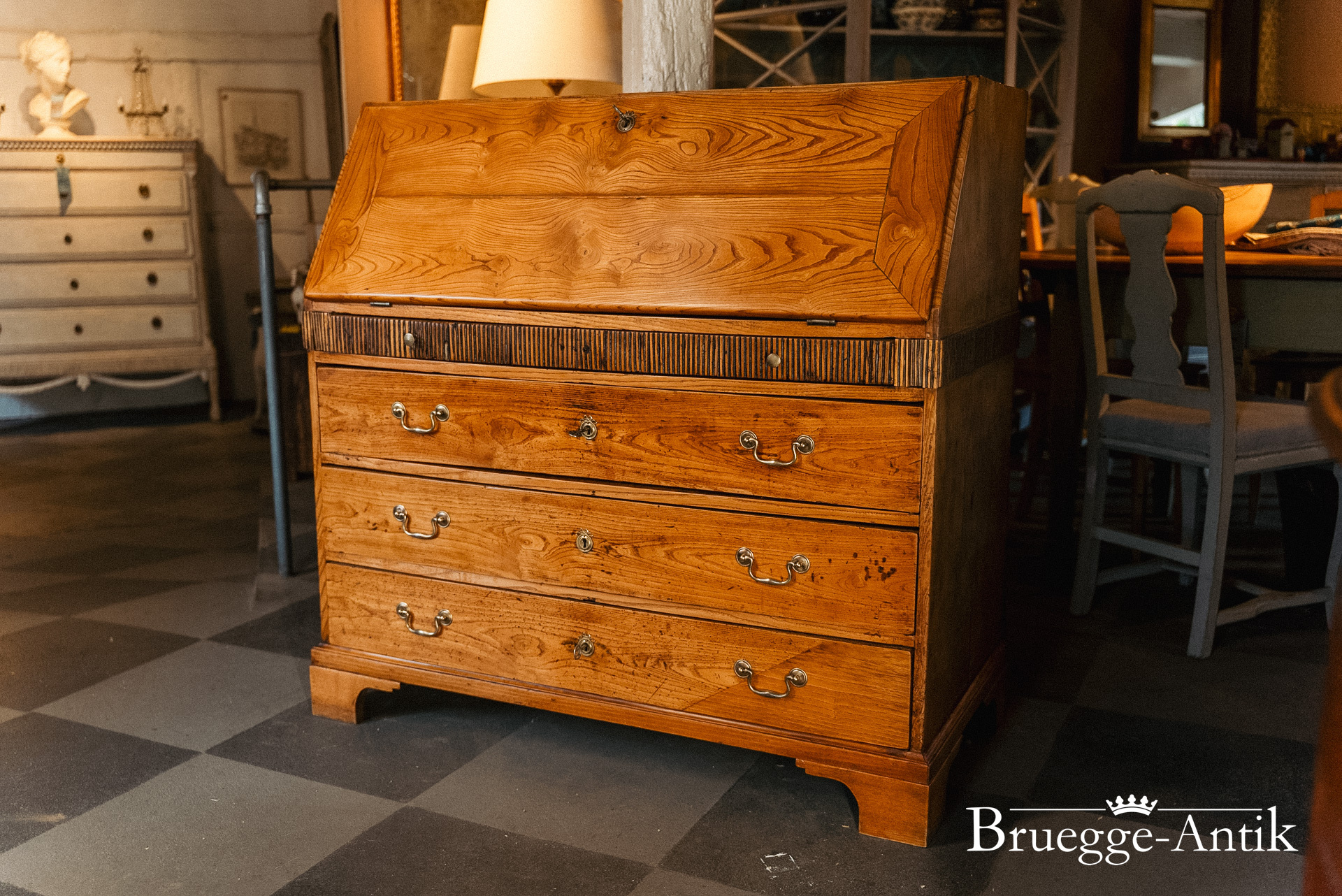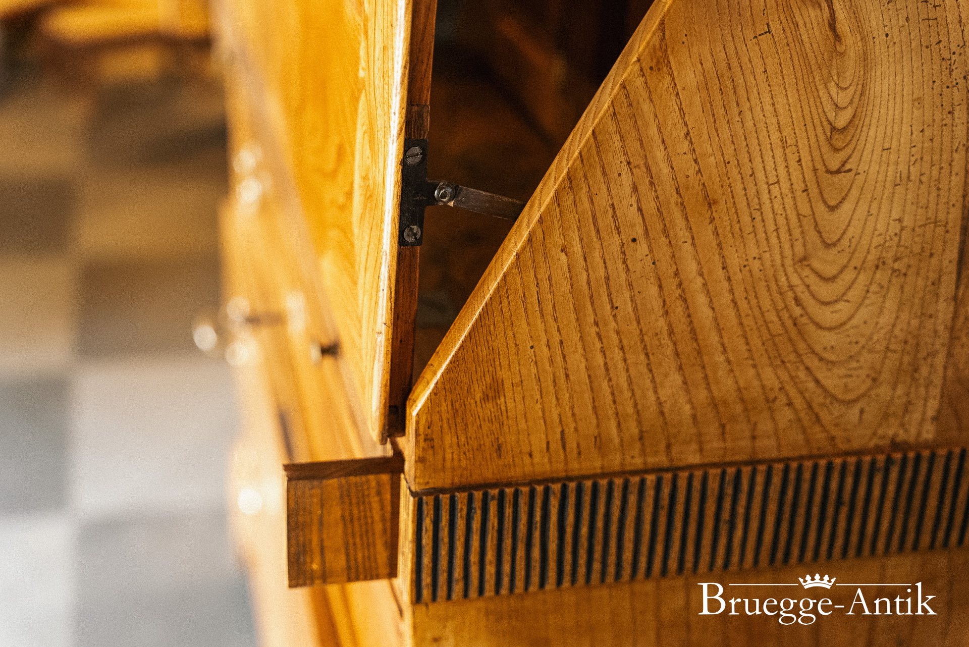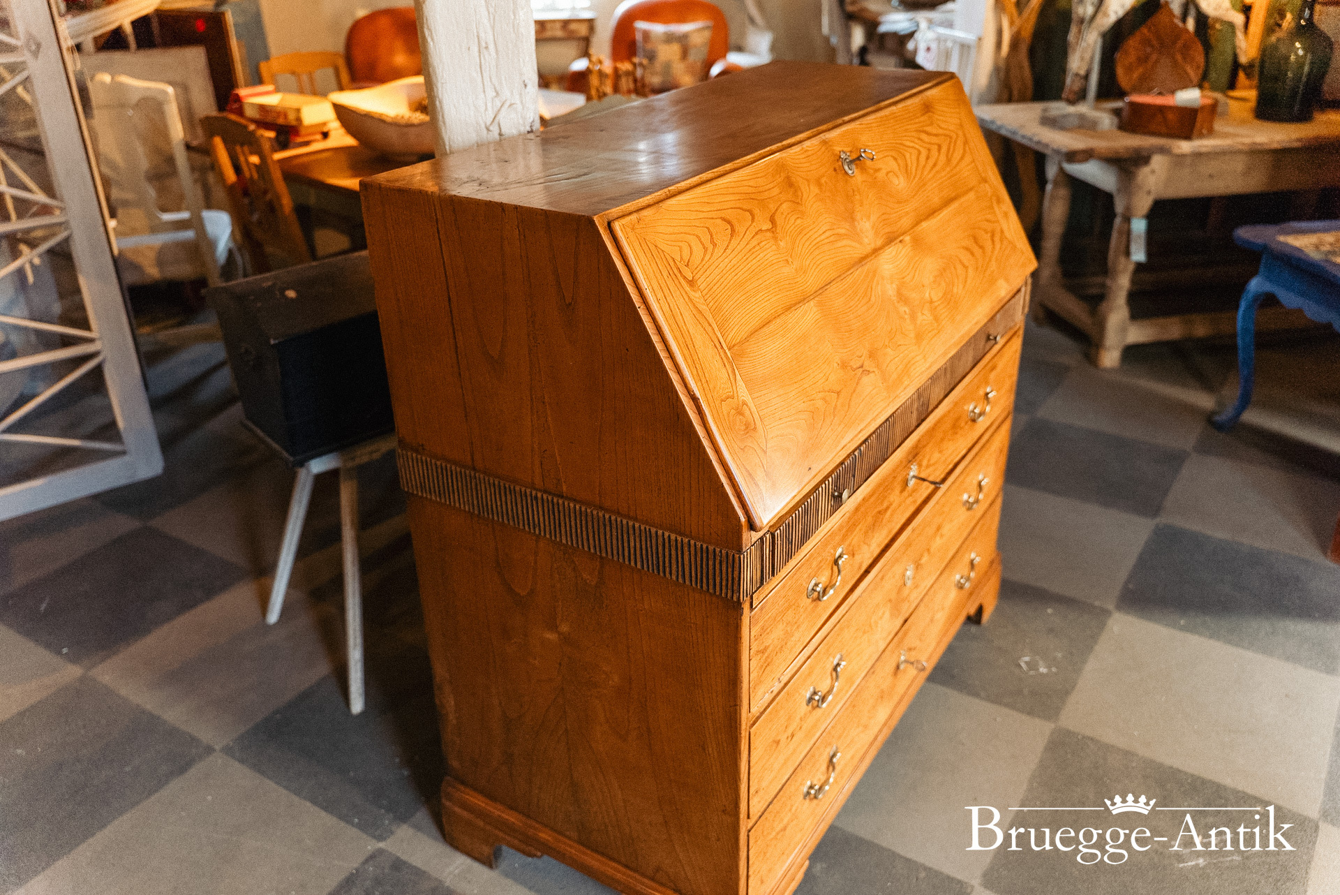 Ein Sekretär mit Extravaganzen, das verspiegelte Innere, ein Geheimfach, ein automatischer Klappenzug für die Sekretärklappe. Die besonderen Elemente einer Messingsonne und des kleinen Zahnfrieses machen das antike Möbel zu einem Unikat. Aus gut gewähltem Ulmenholz stabil gebaut und aufwändig bei uns restauriert.
