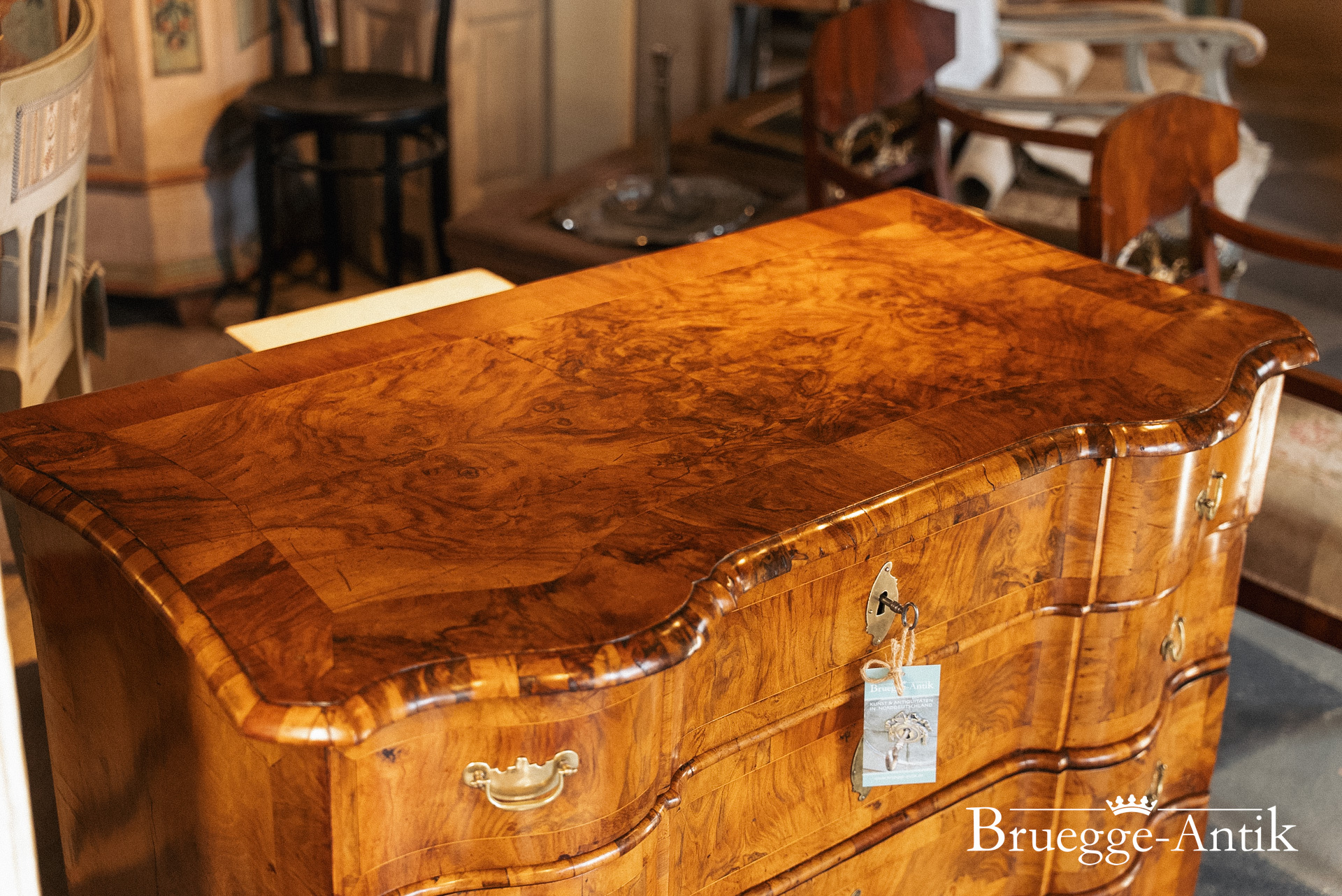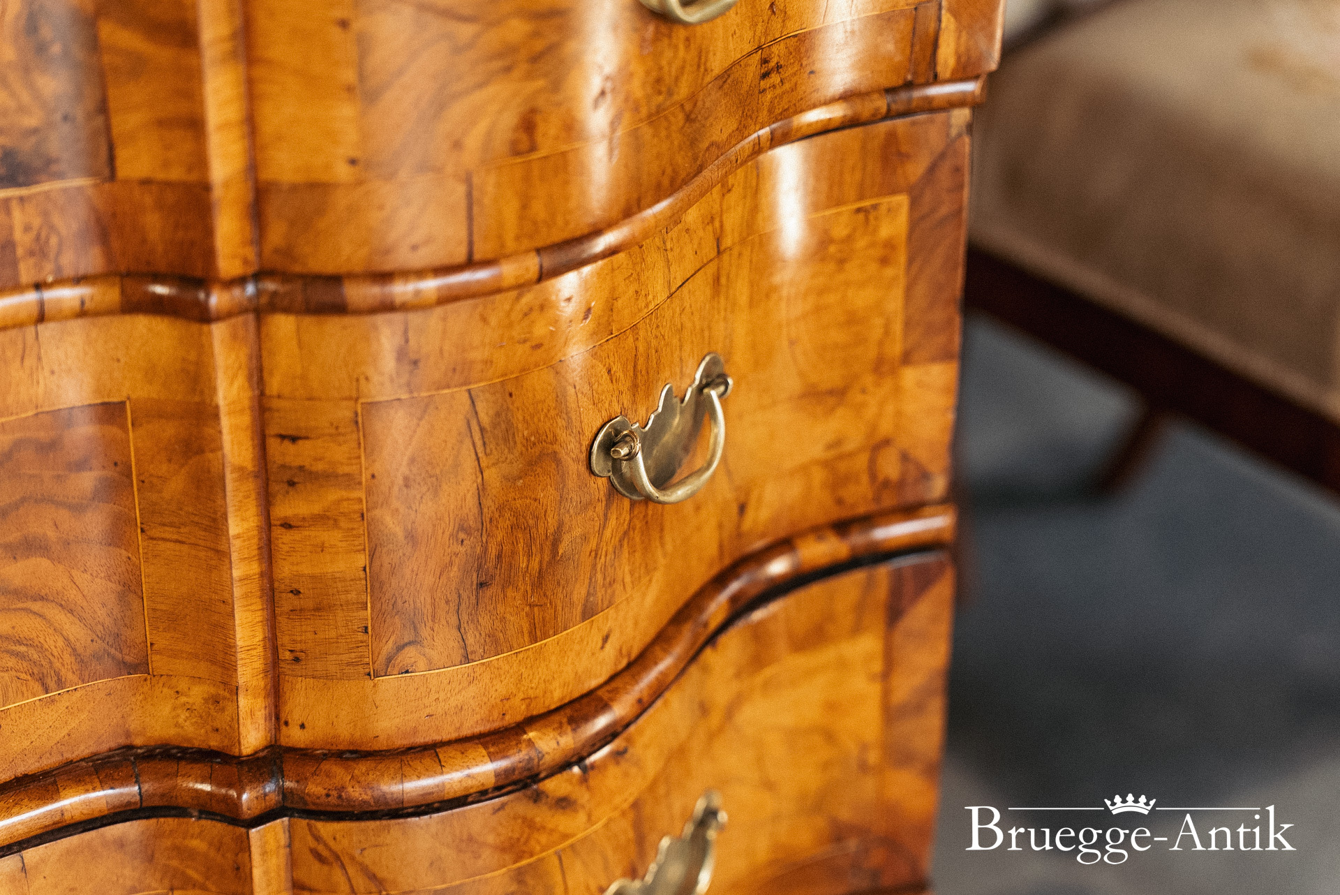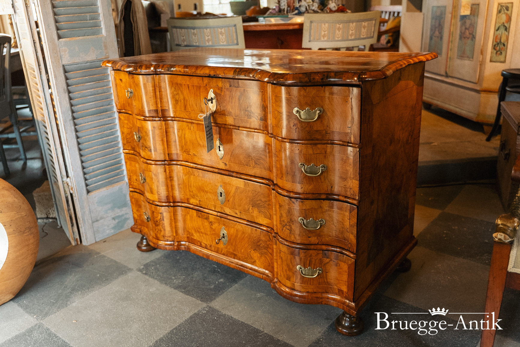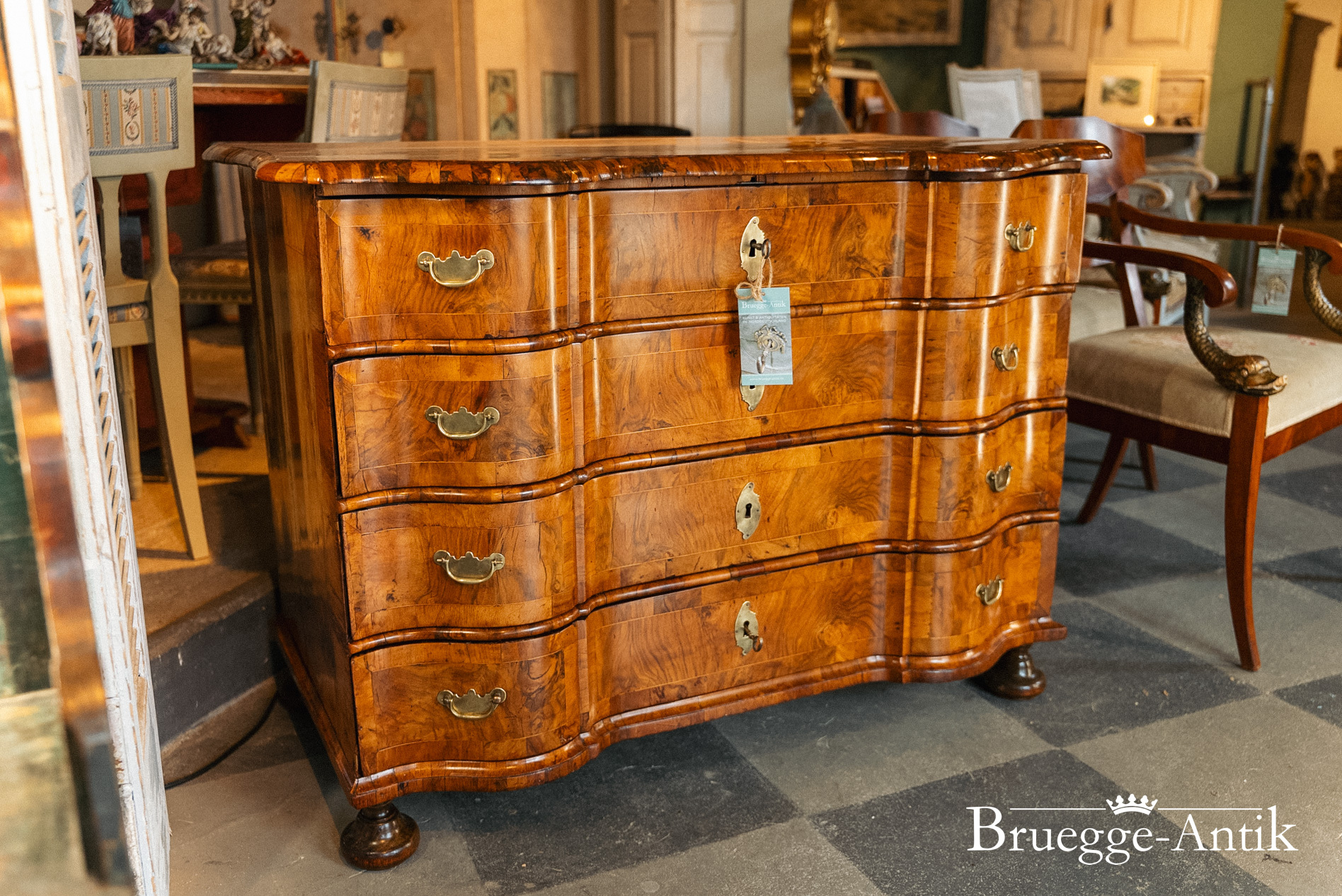 Ein Traum einer edlen Barockkommode mit eleganten konkaven Schwüngen und vier großen Schubladen. Von Hand in mehreren Schichten mit Schelllack poliert und aufwändig restauriert. Ein repräsentatives Möbel der deutschen Antikkultur in warmen Holztönen mit großer Ausstrahlung.