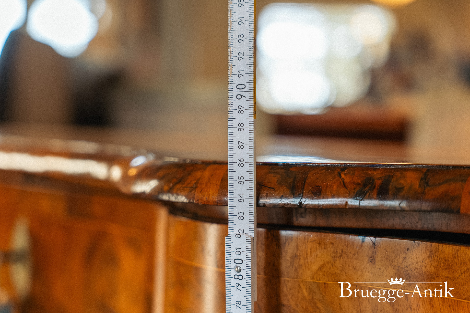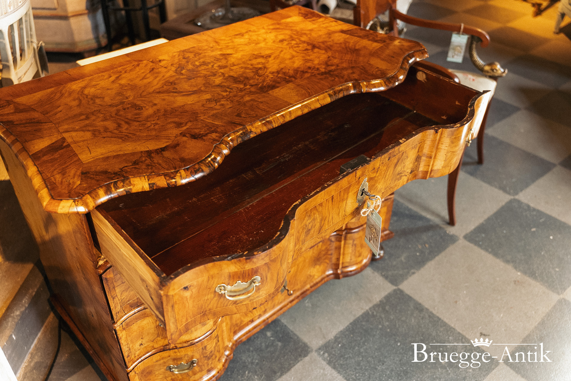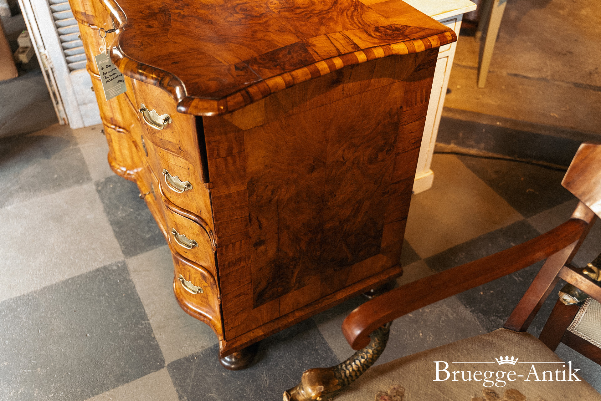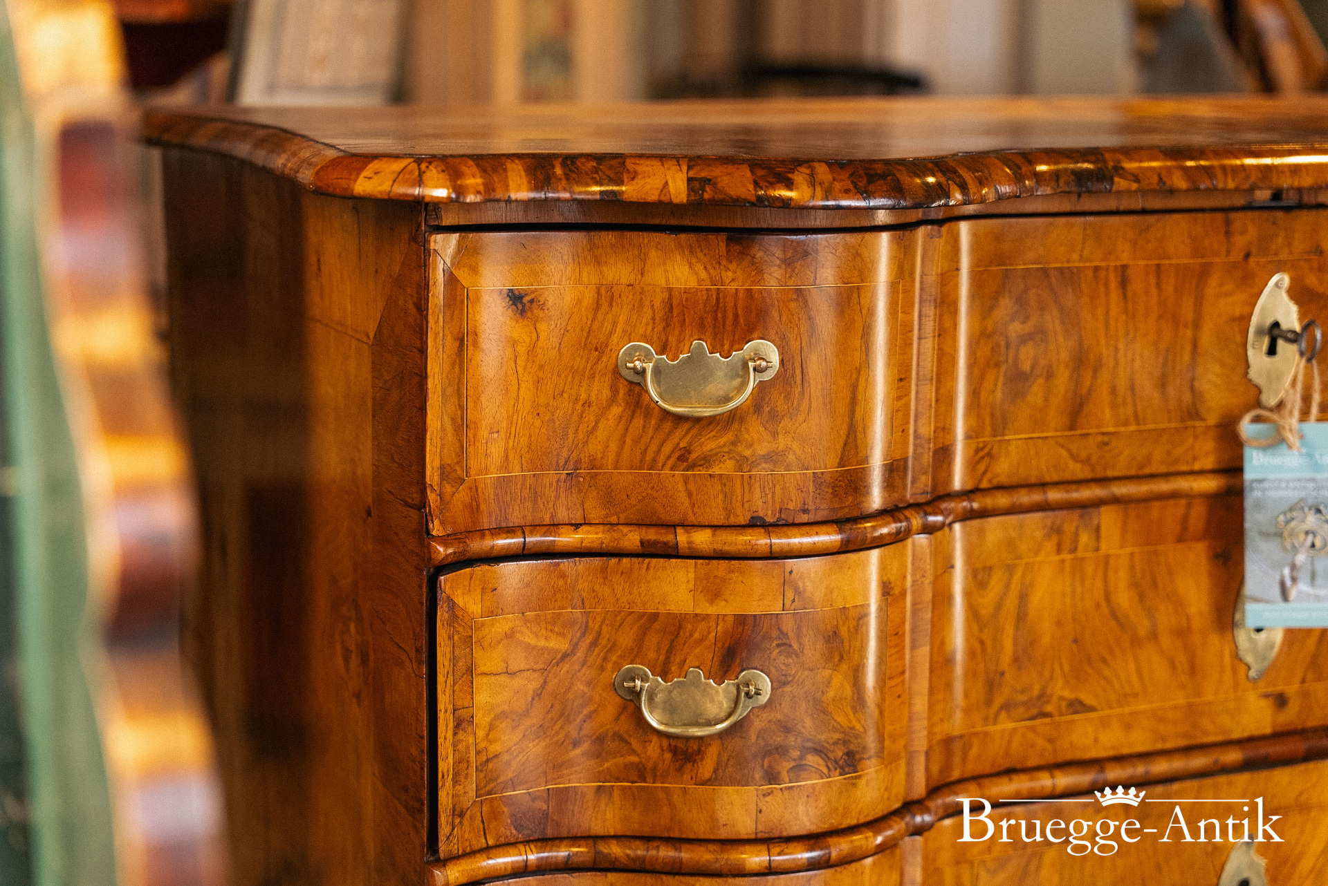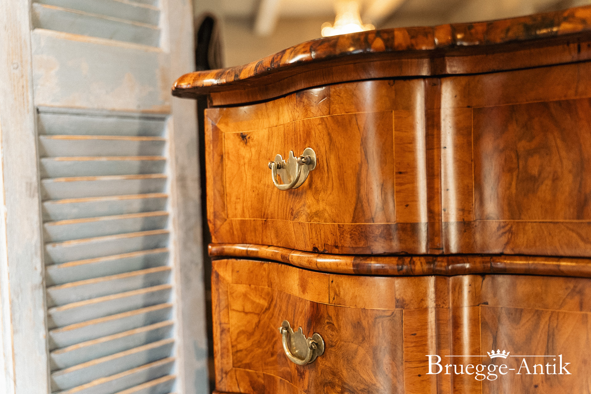 Ein Traum einer edlen Barockkommode mit eleganten konkaven Schwüngen und vier großen Schubladen. Von Hand in mehreren Schichten mit Schelllack poliert und aufwändig restauriert. Ein repräsentatives Möbel der deutschen Antikkultur in warmen Holztönen mit großer Ausstrahlung.