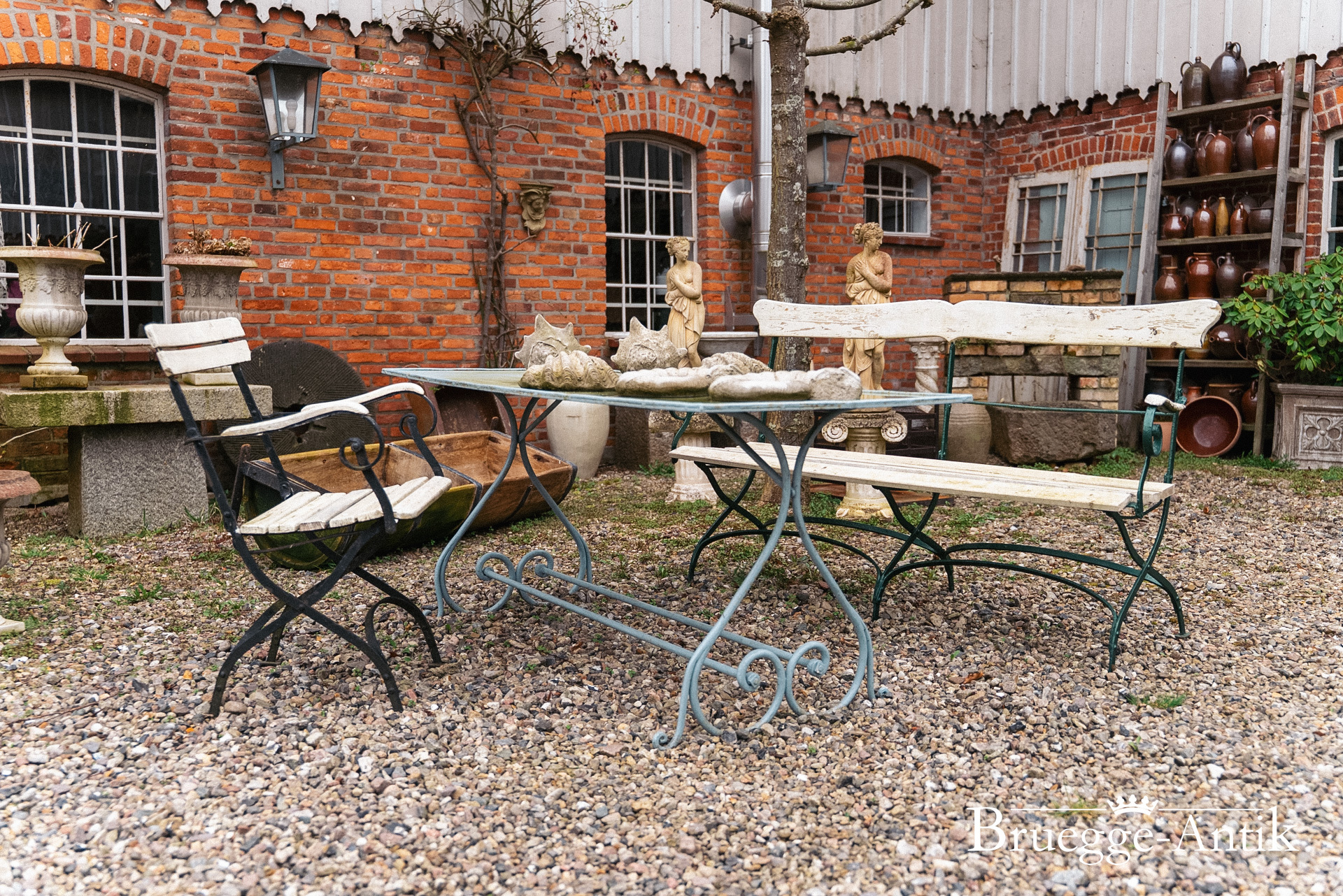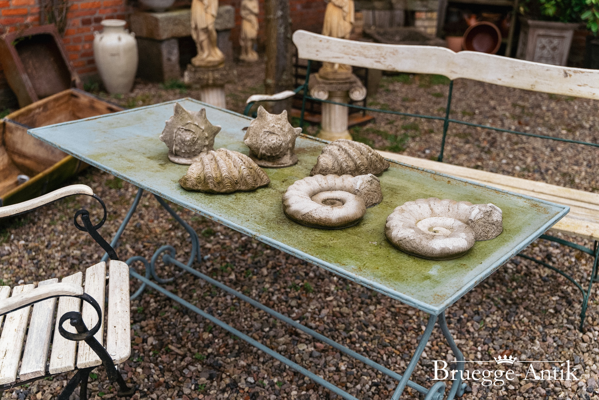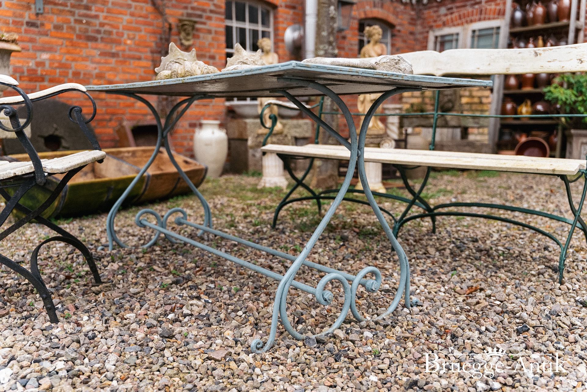 Ein bisschen Algengrün hat diese Gartengarnitur vom Meer, die sich schnell mit frischem Anstrich in das neue Frühjahr versetzen lässt. Gerne übernehmen wir hier Ihre Wunschfarbe, ein bisschen Pflege verlangen diese Gartenmöbel schon, aber ihr antiker Charme ist unvergleichlich.