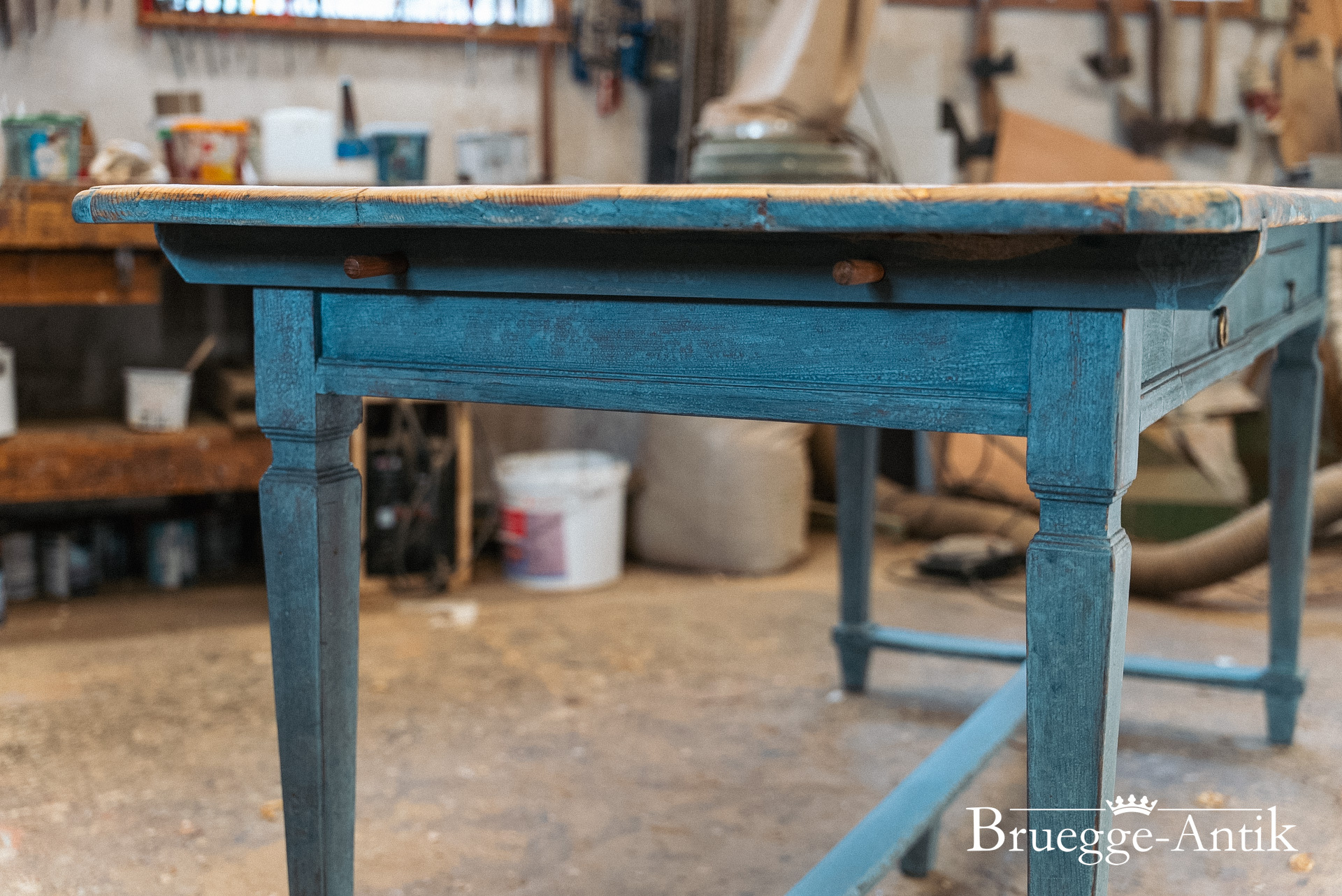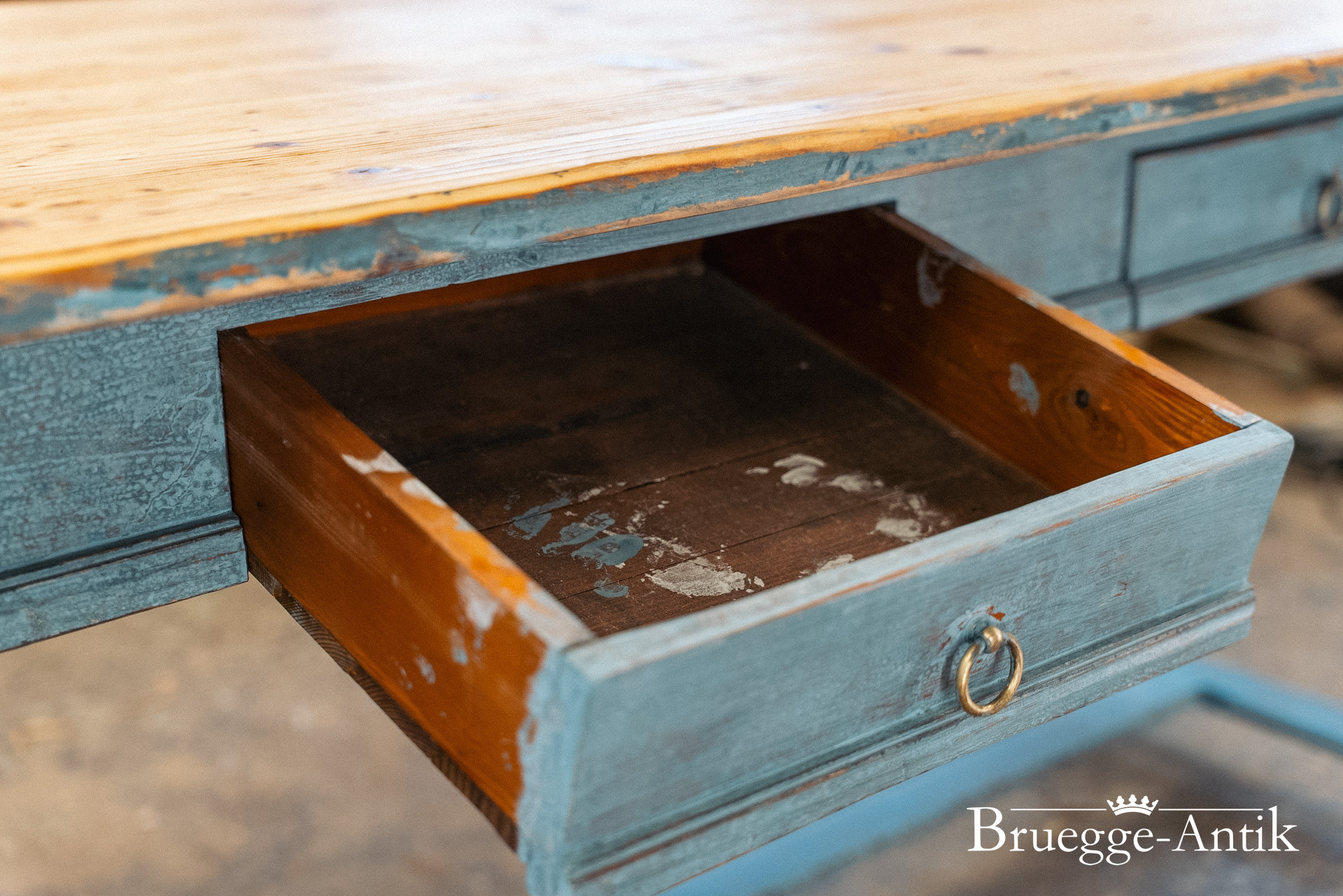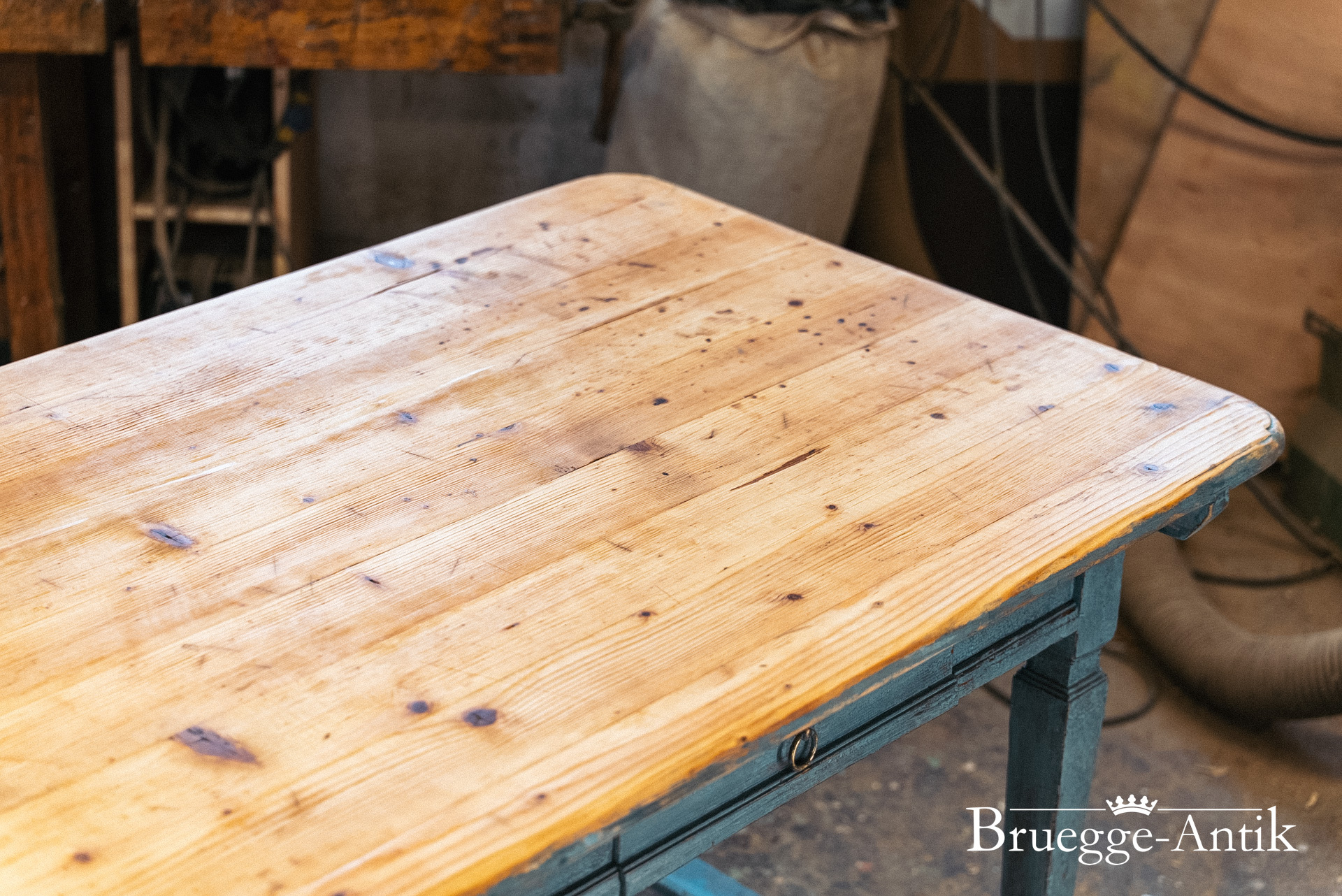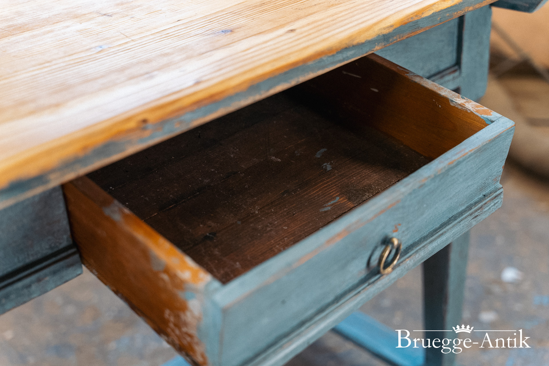 Feiner blau gefasster Tisch aus unserer Serie Fisherman´s, die an das Meer erinnert und die wertvolle Arbeit dieses antiken Berufes. Möbel dieser Serie sind bewusst schlicht gehalten und hier hat die helle Kiefernplatte die Farbe gewaschenen Meersandes. Mit Liebe restauriert und gebrauchsfertig.