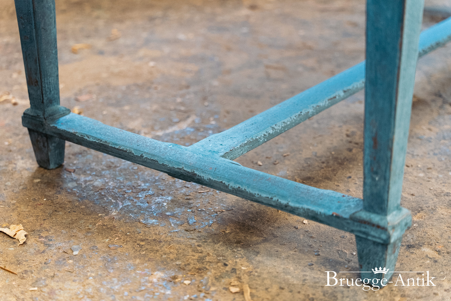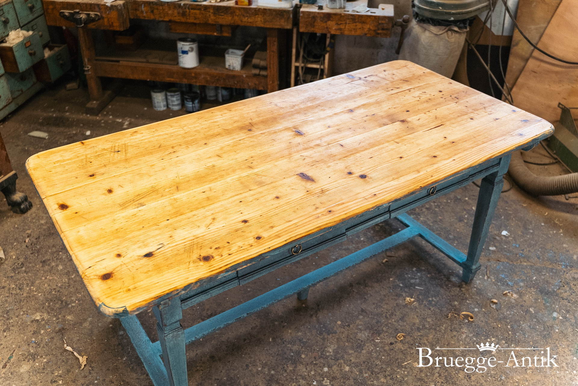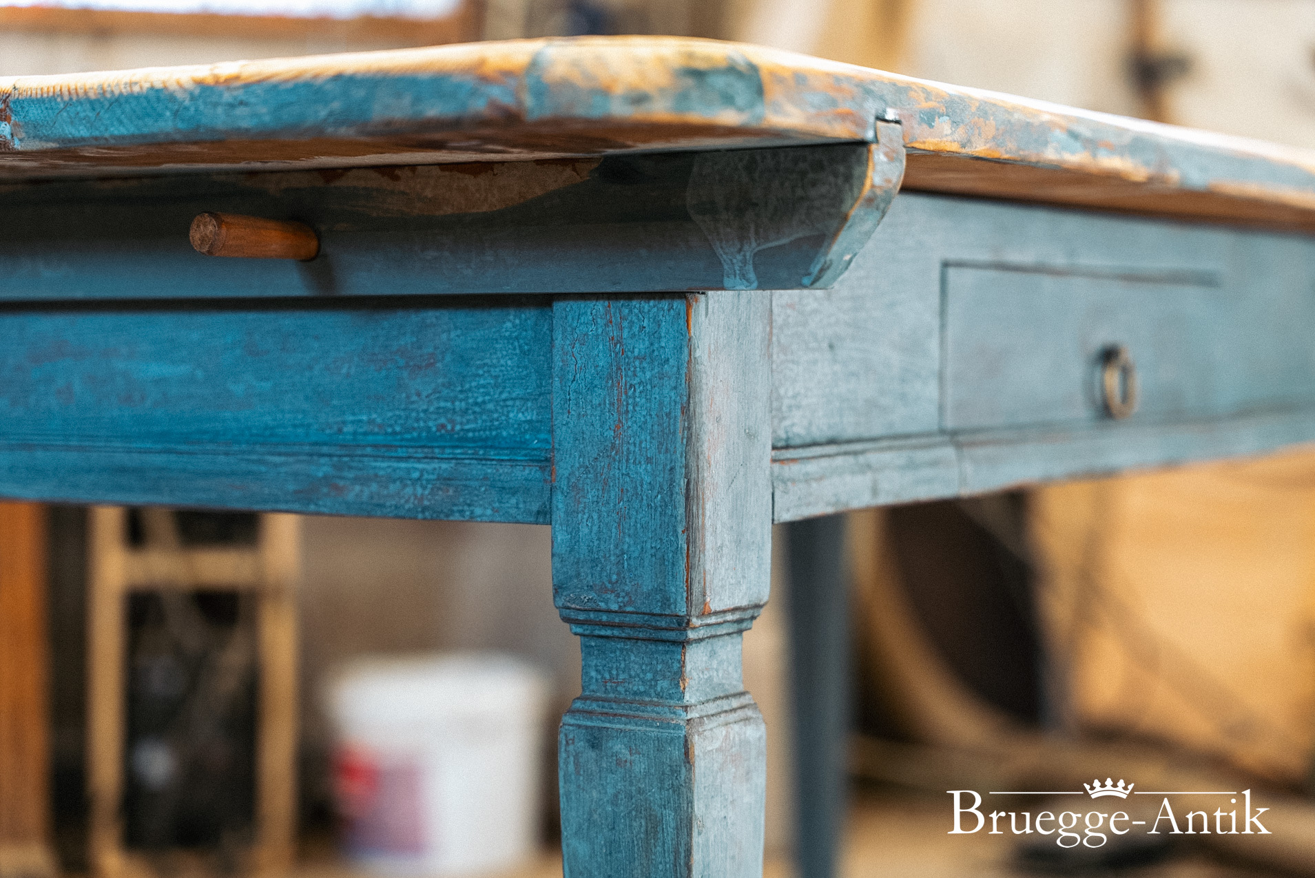 Feiner blau gefasster Tisch aus unserer Serie Fisherman´s, die an das Meer erinnert und die wertvolle Arbeit dieses antiken Berufes. Möbel dieser Serie sind bewusst schlicht gehalten und hier hat die helle Kiefernplatte die Farbe gewaschenen Meersandes. Mit Liebe restauriert und gebrauchsfertig.