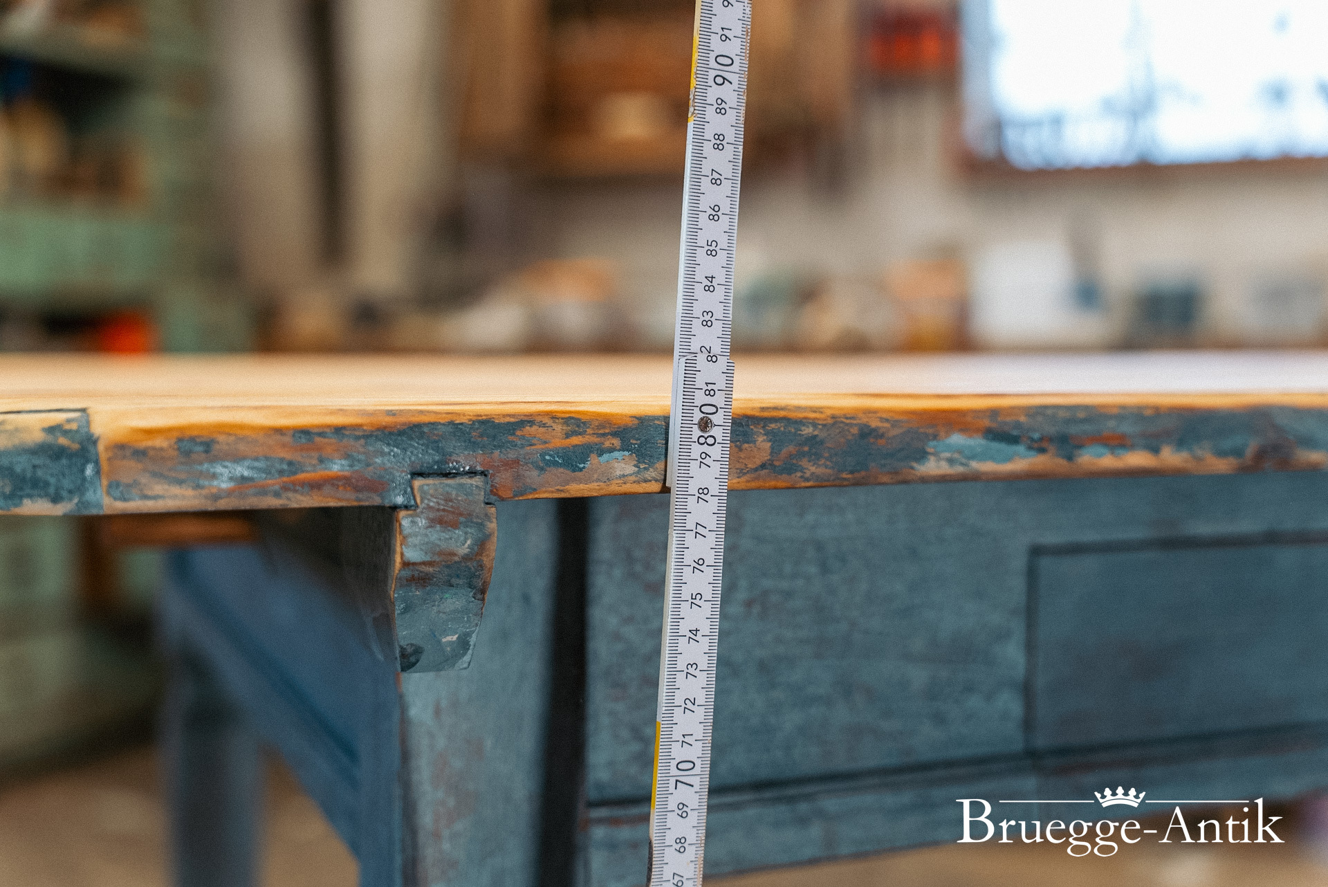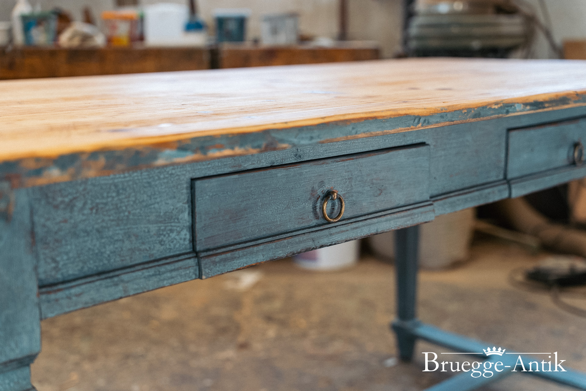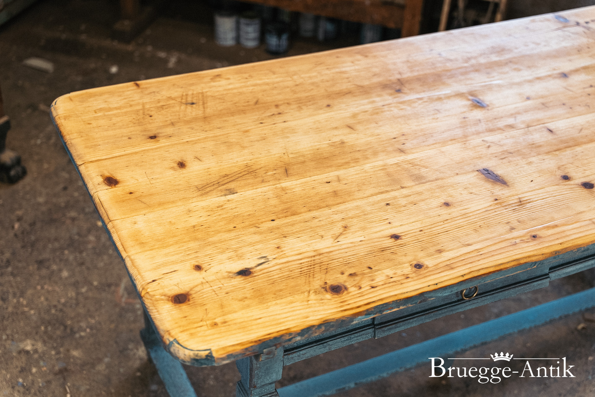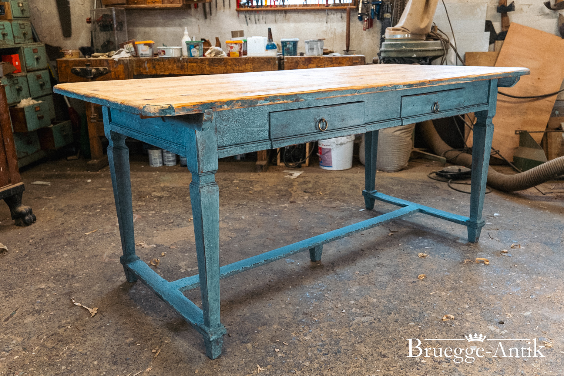 Feiner blau gefasster Tisch aus unserer Serie Fisherman´s, die an das Meer erinnert und die wertvolle Arbeit dieses antiken Berufes. Möbel dieser Serie sind bewusst schlicht gehalten und hier hat die helle Kiefernplatte die Farbe gewaschenen Meersandes. Mit Liebe restauriert und gebrauchsfertig.