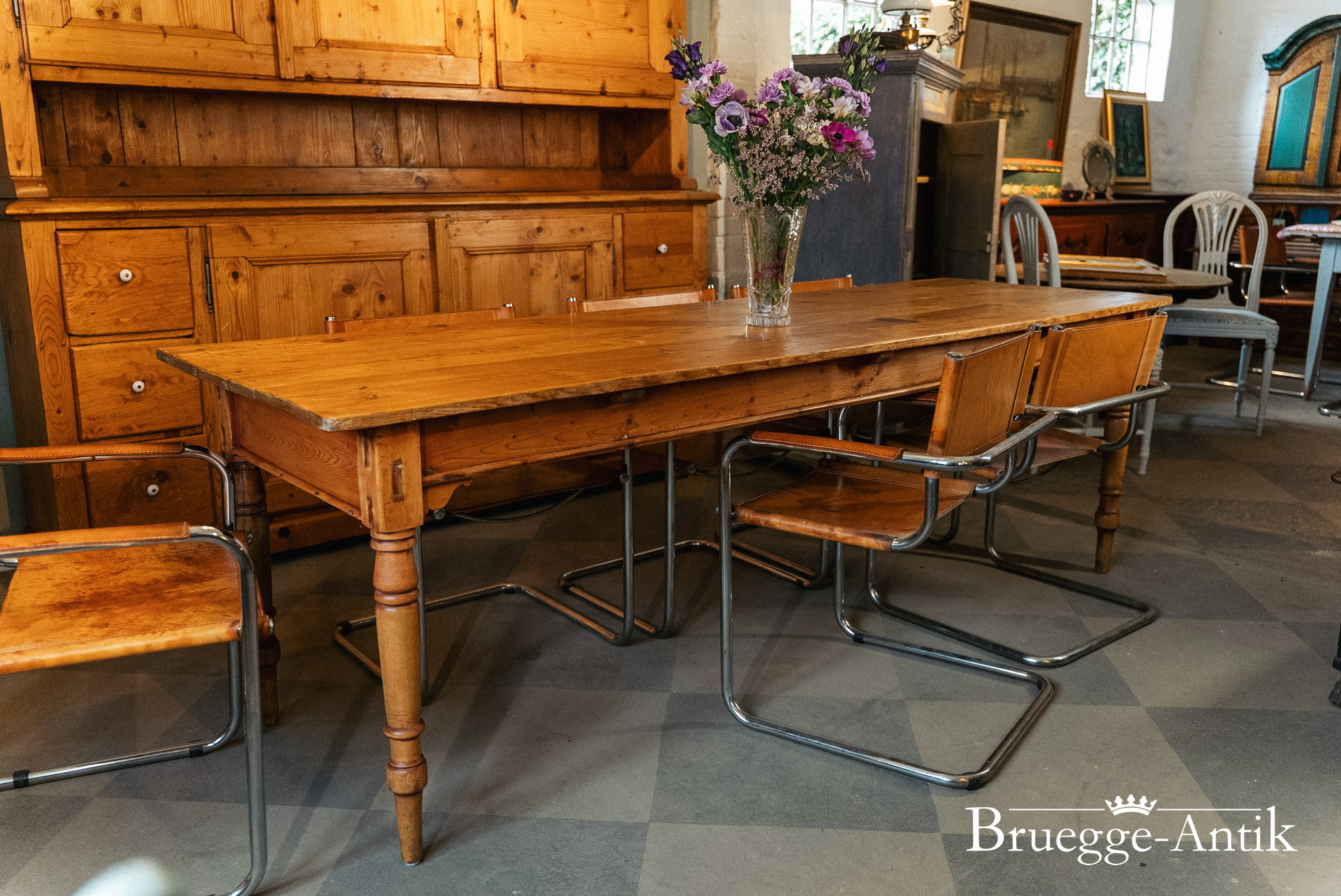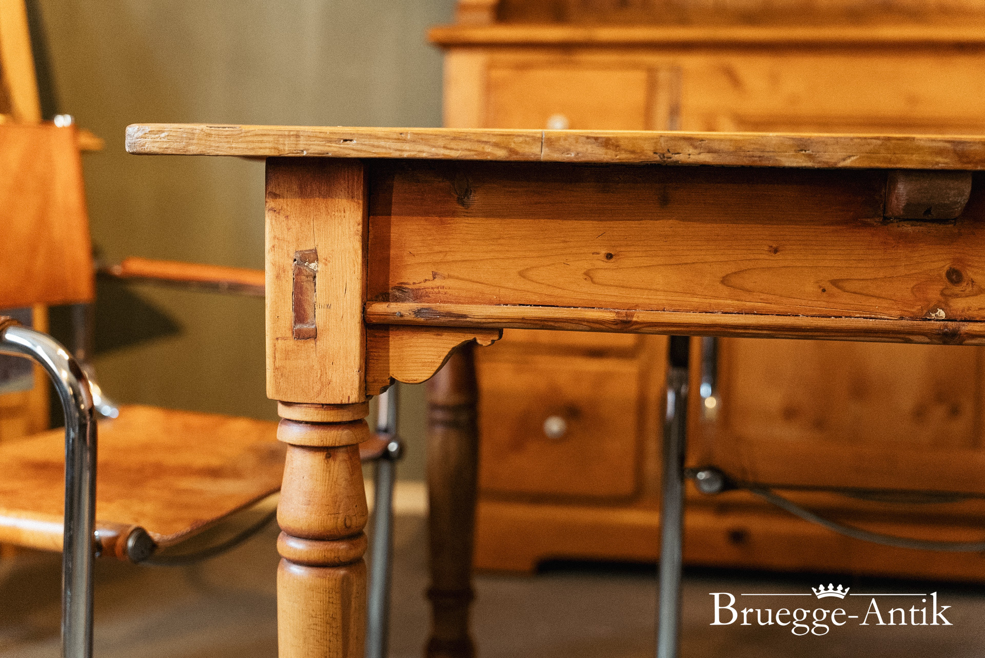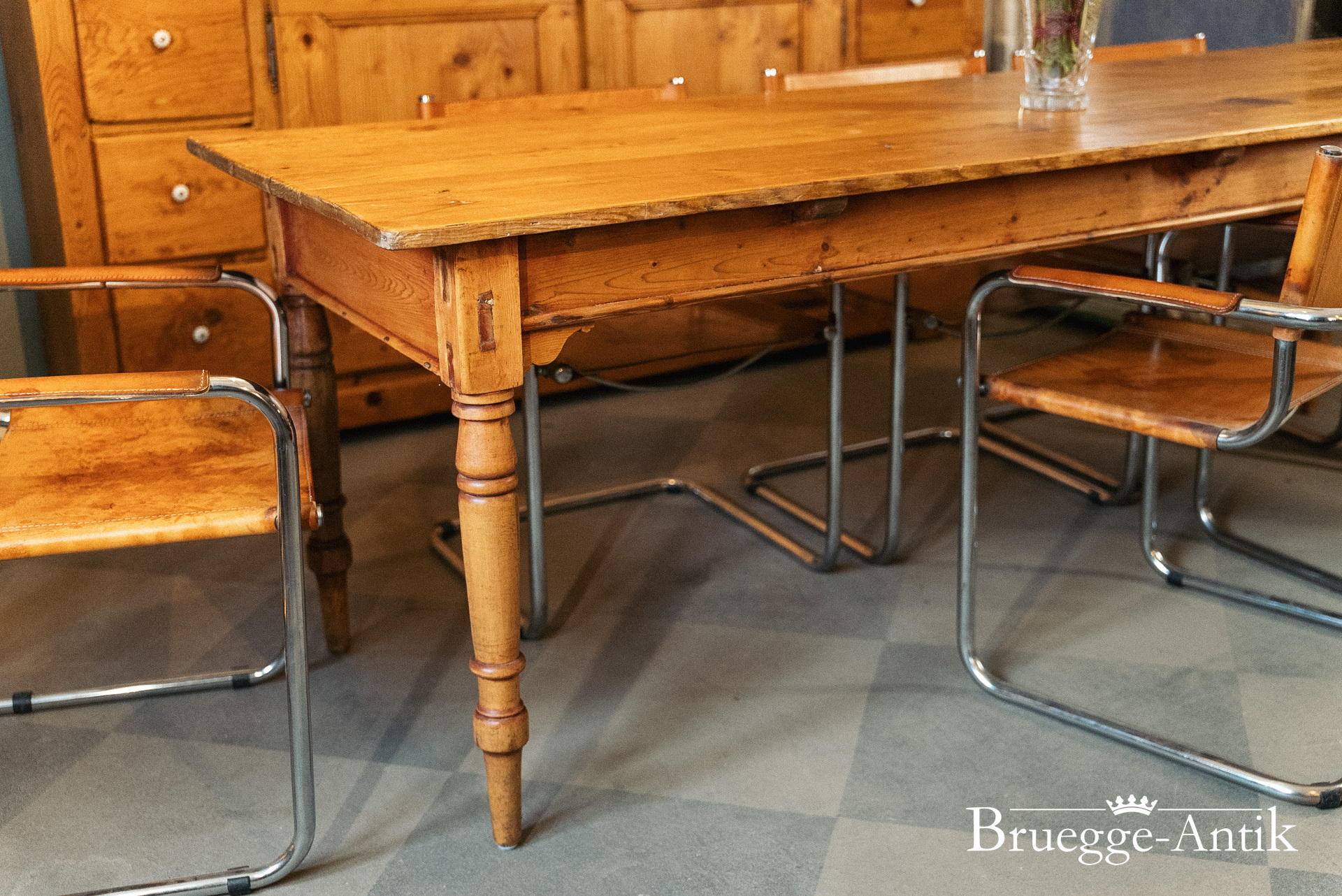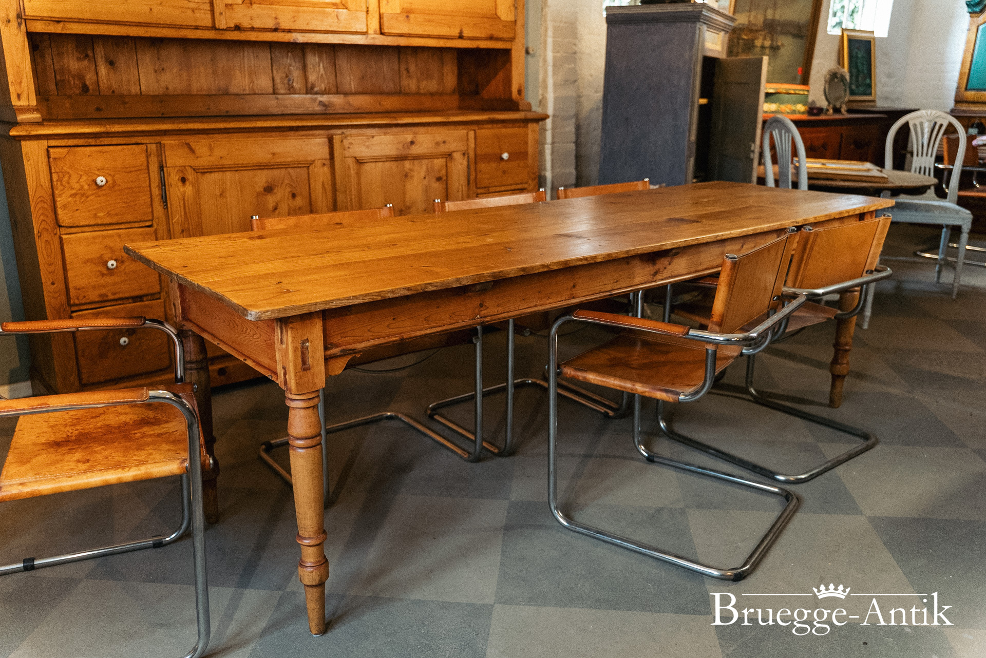 Großer antiker Kieferntisch mit Schublade am Ende, Platz für 10 Personen. Warme Patina und ein schlichtes gedrechseltes Bein machen diesen Tisch zum schönen Einzelstück für den besonderen Essplatz. Fertig renoviert und wohnfertig.