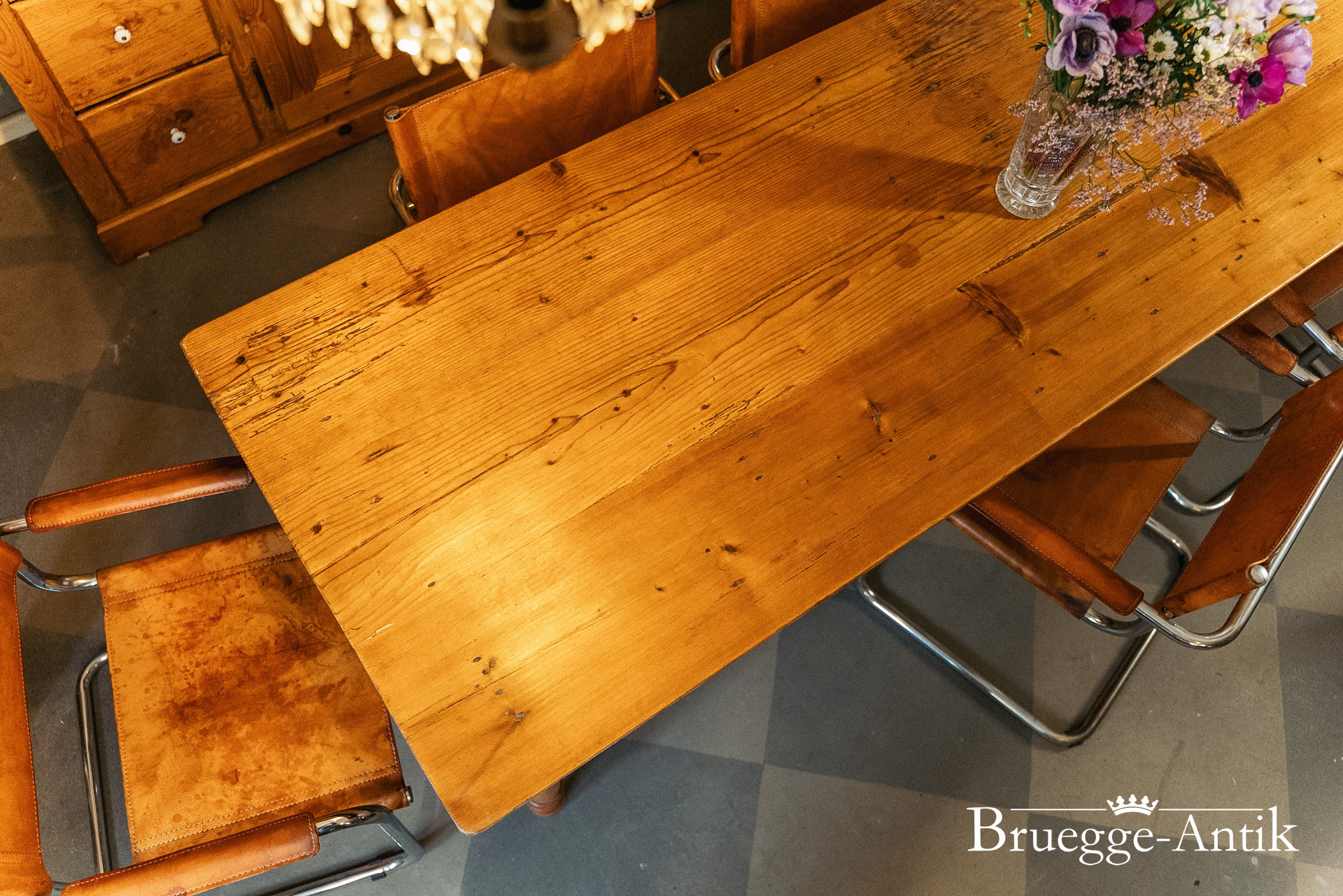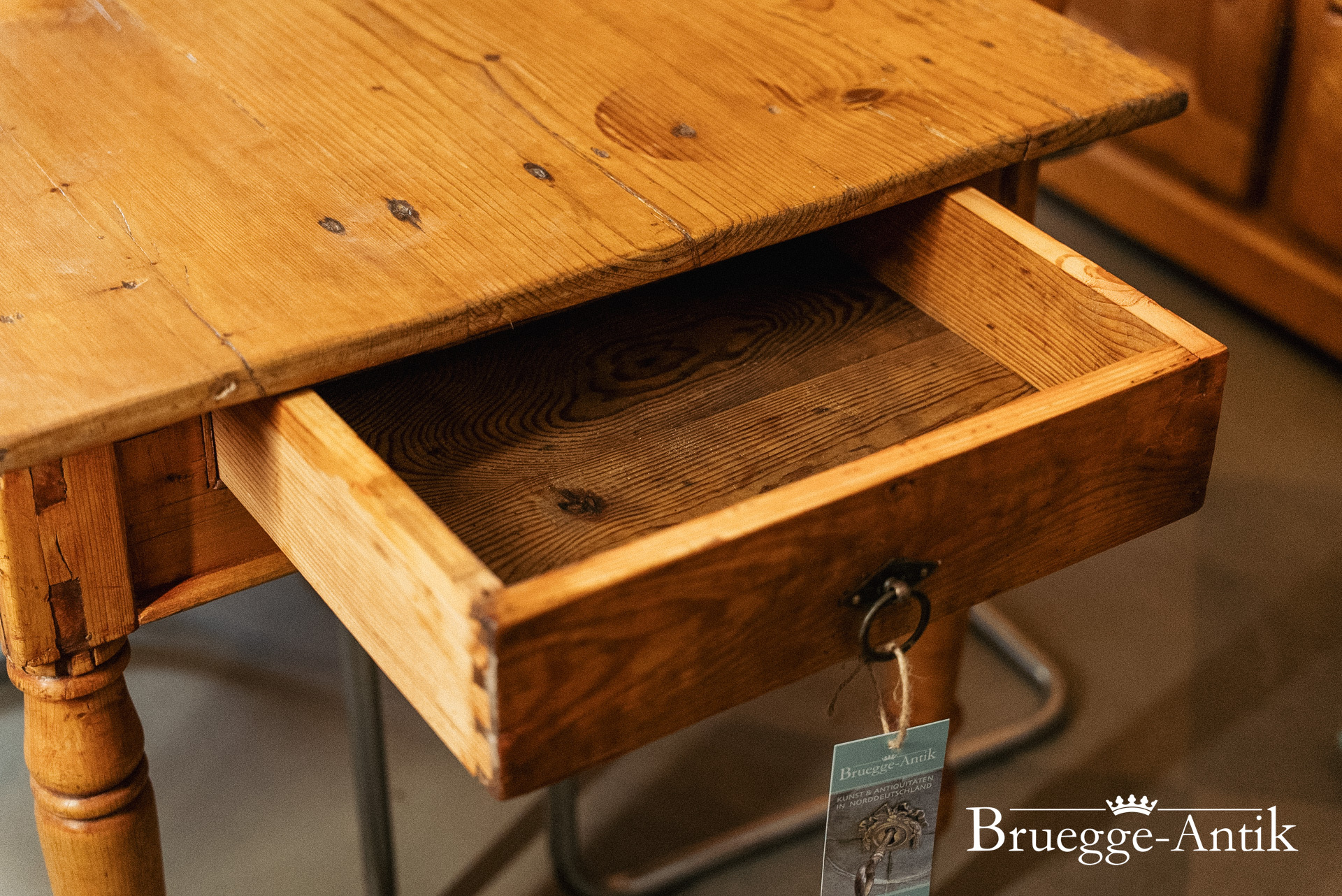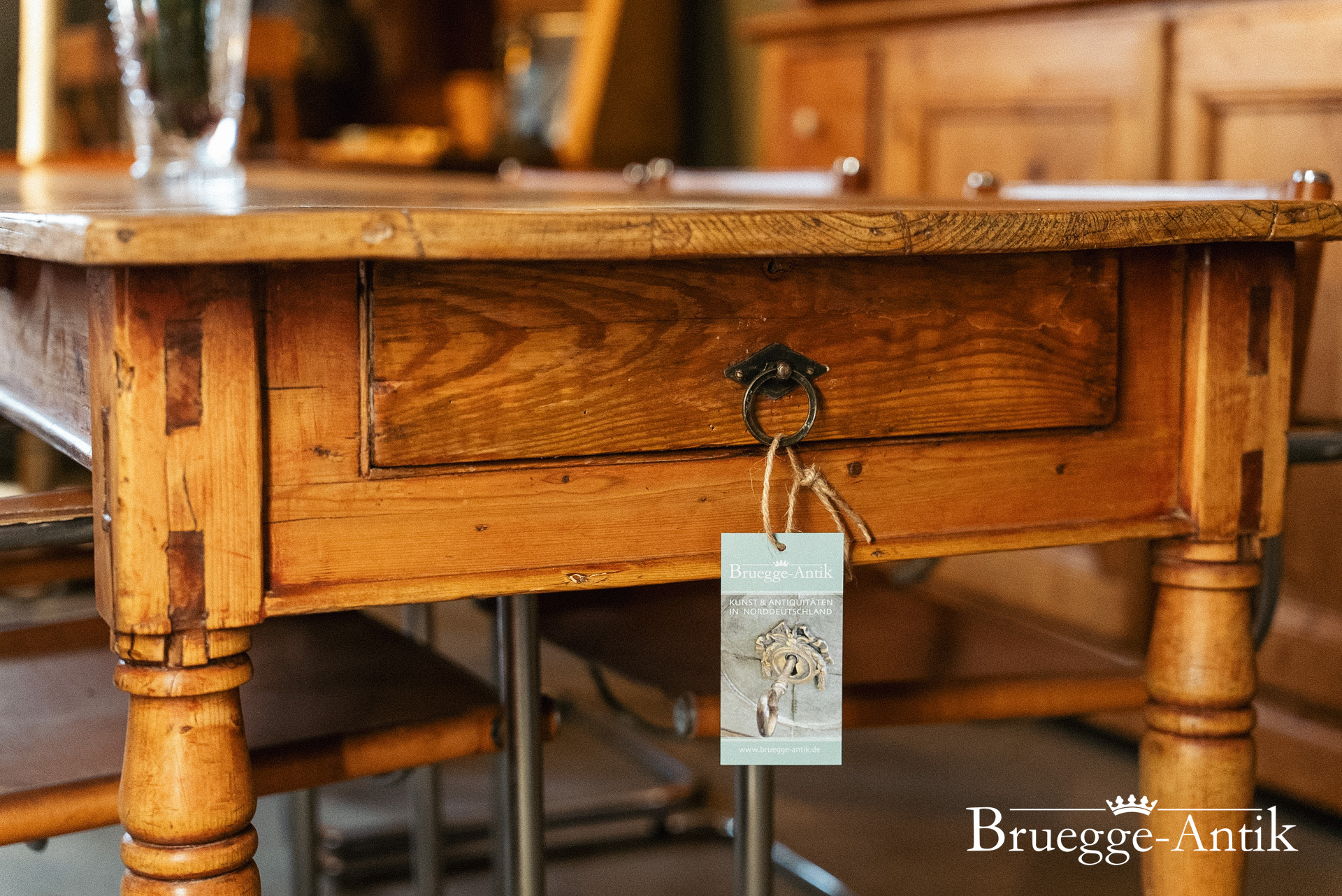 Großer antiker Kieferntisch mit Schublade am Ende, Platz für 10 Personen. Warme Patina und ein schlichtes gedrechseltes Bein machen diesen Tisch zum schönen Einzelstück für den besonderen Essplatz. Fertig renoviert und wohnfertig.