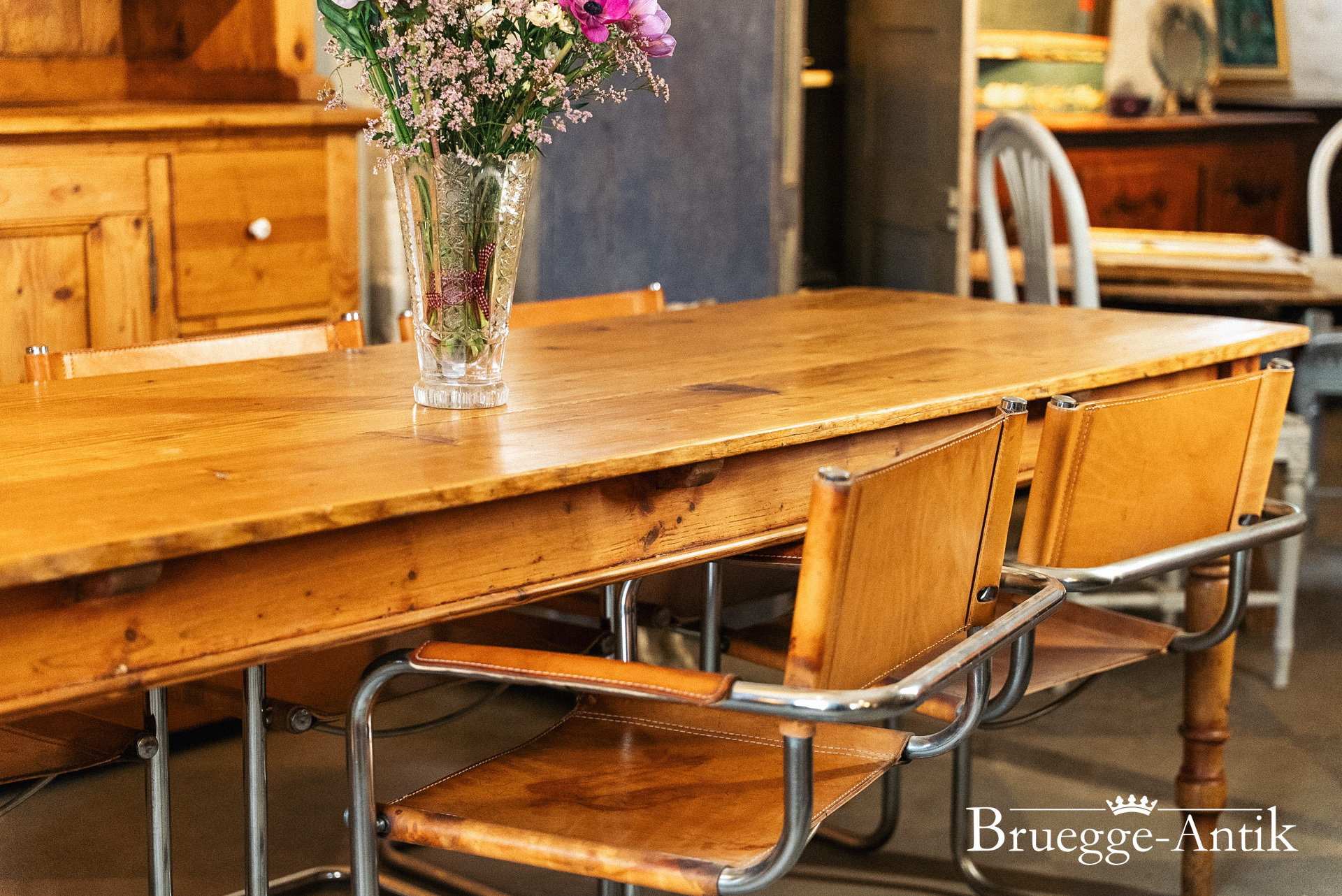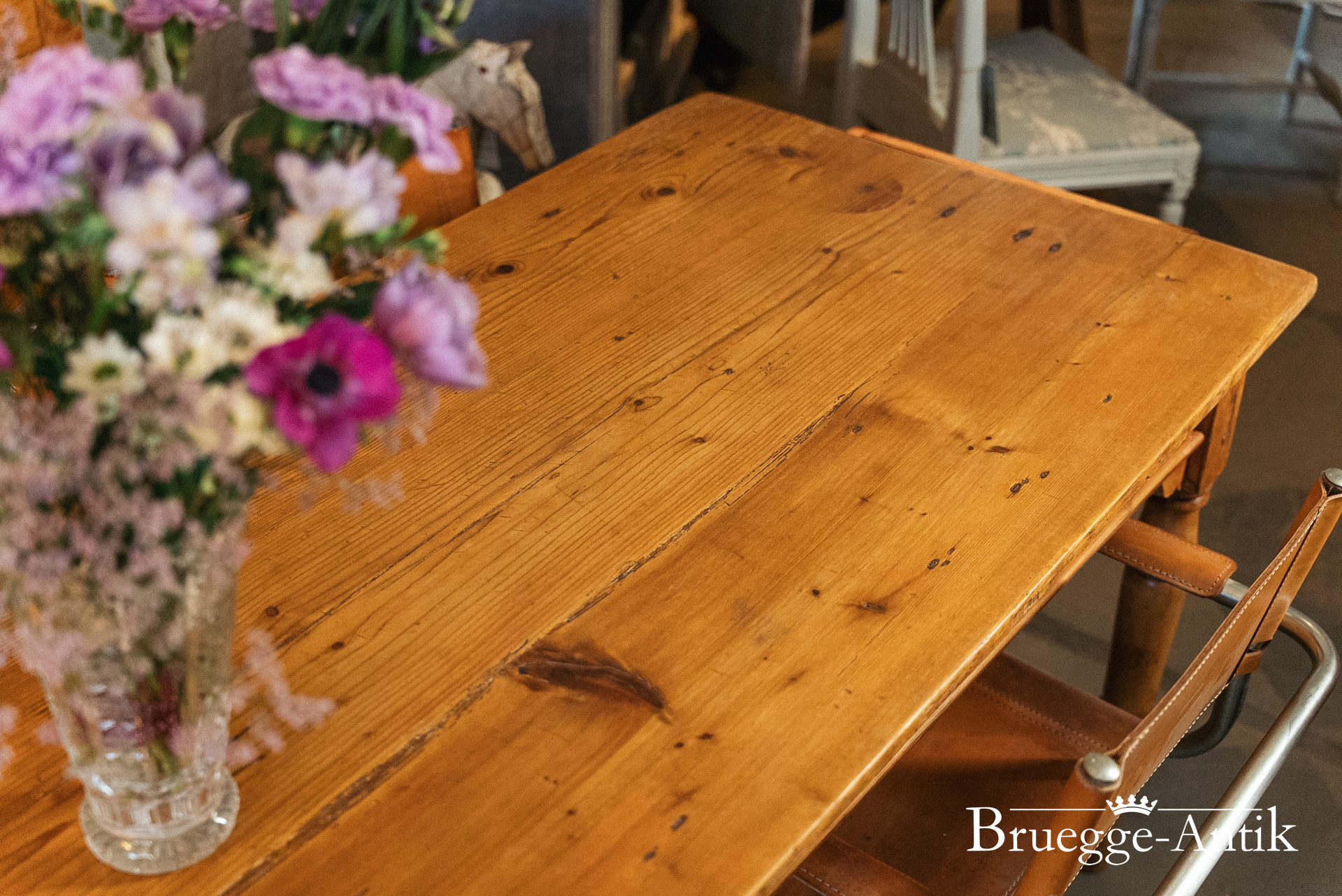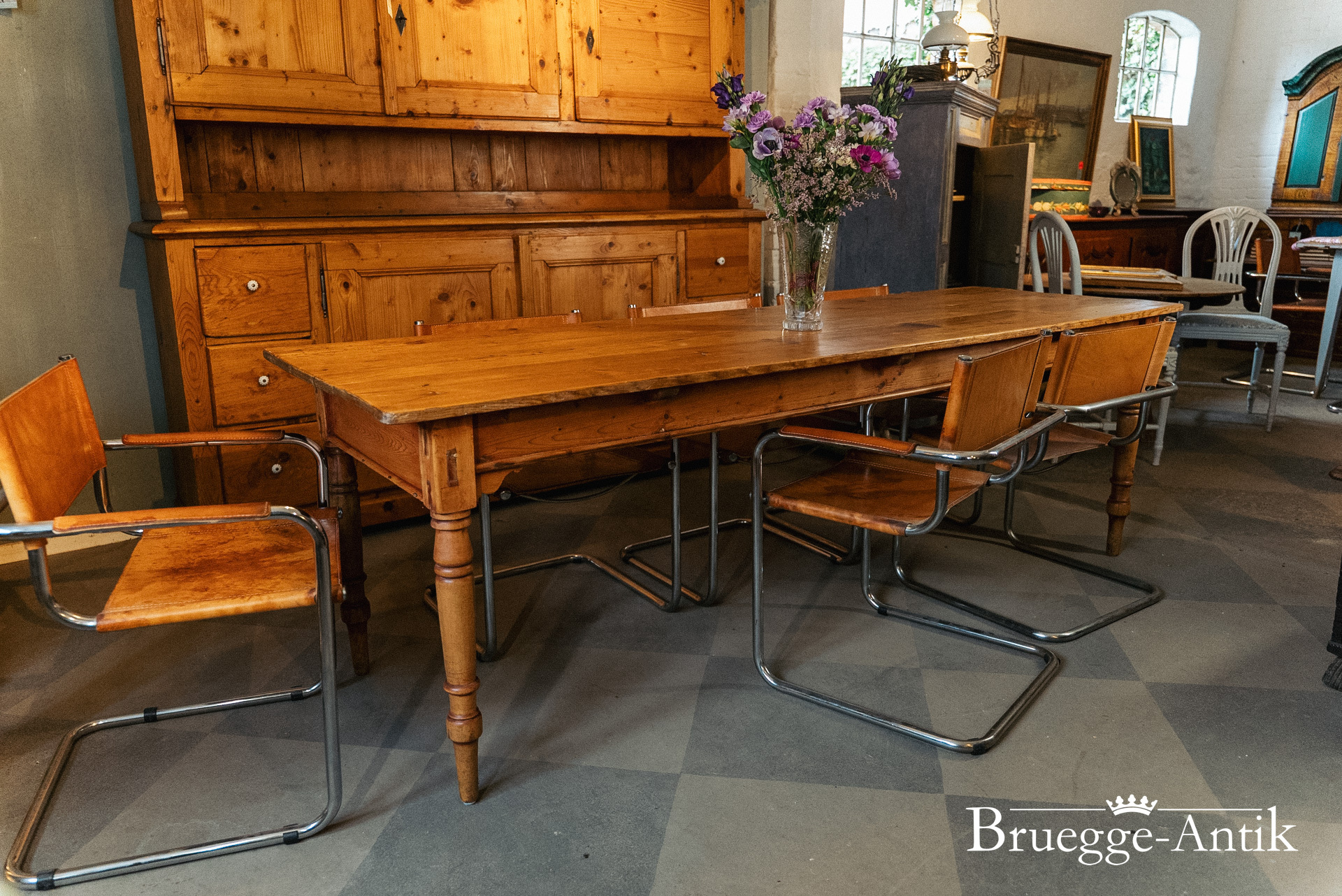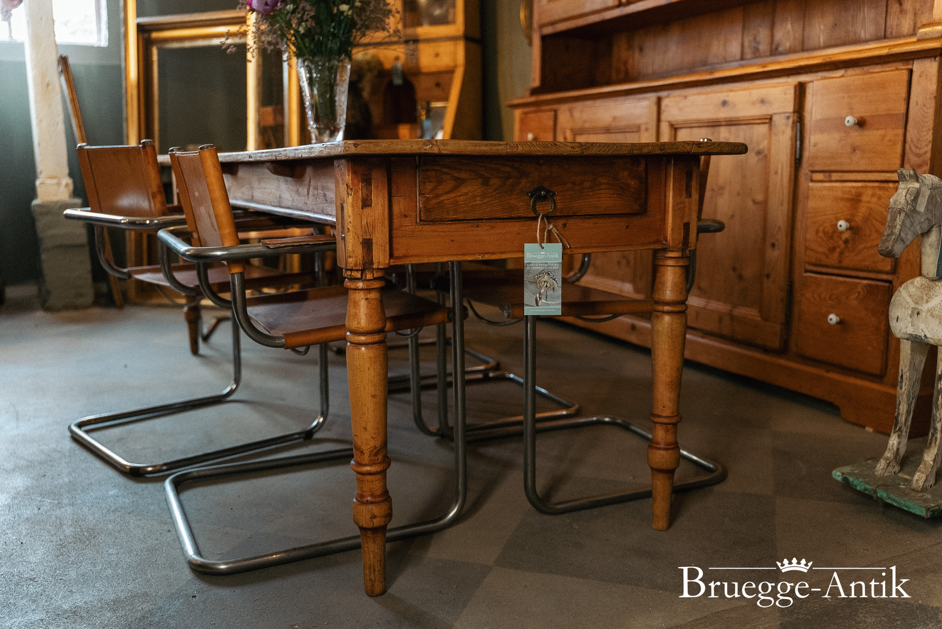 Großer antiker Kieferntisch mit Schublade am Ende, Platz für 10 Personen. Warme Patina und ein schlichtes gedrechseltes Bein machen diesen Tisch zum schönen Einzelstück für den besonderen Essplatz. Fertig renoviert und wohnfertig.