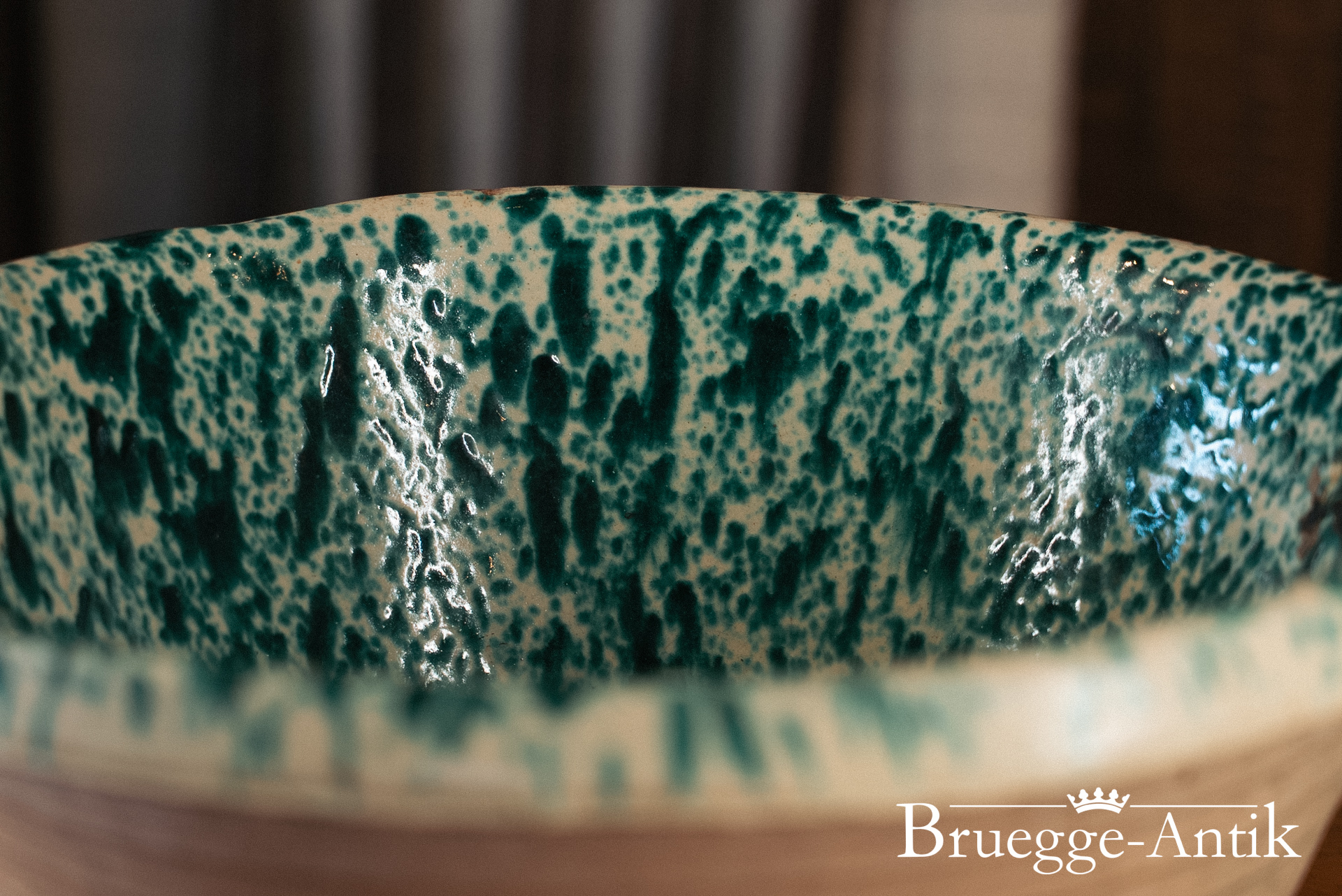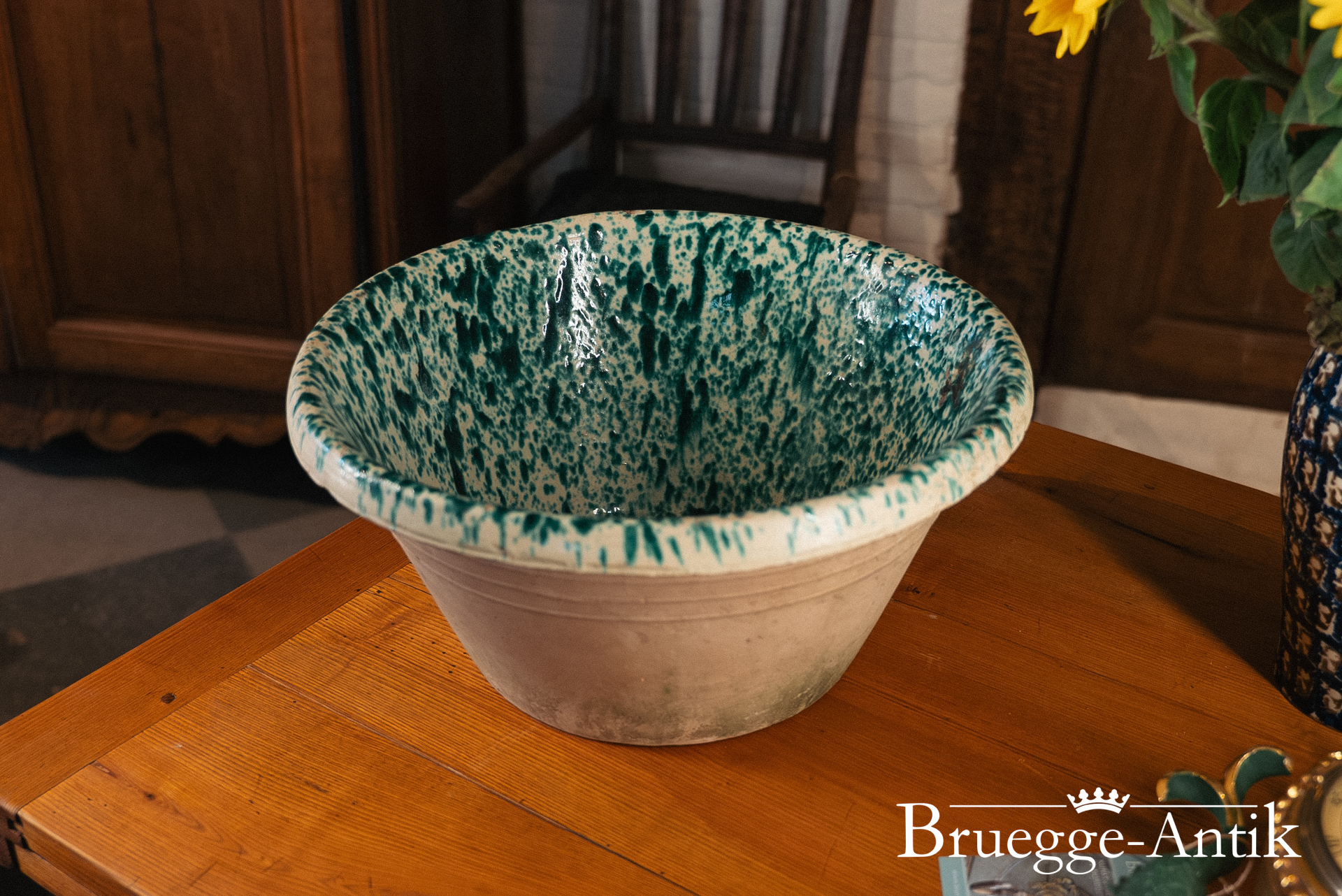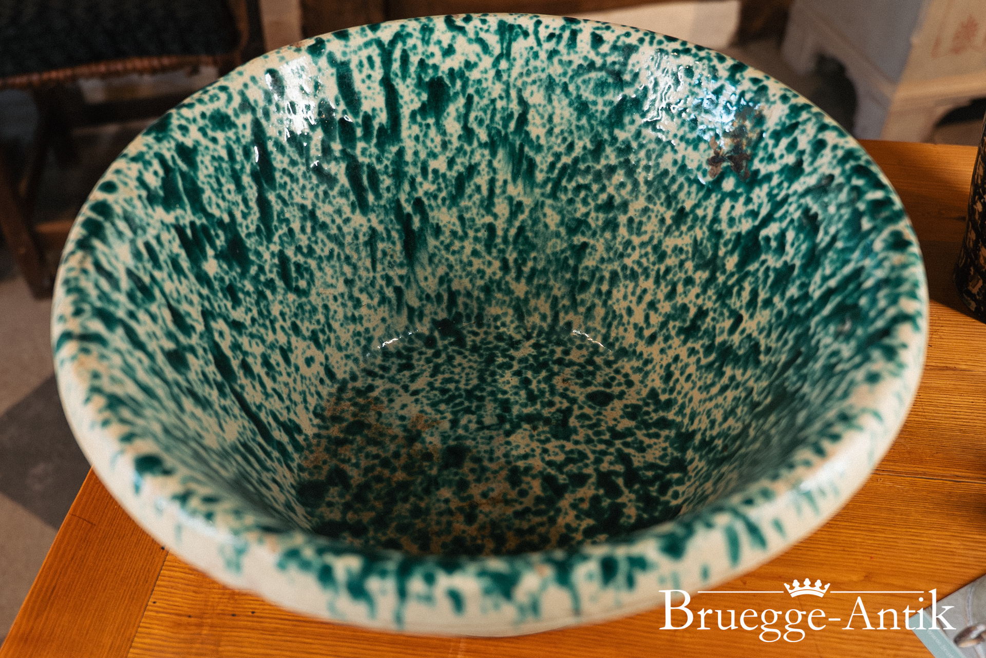Antike Schale aus der Toskana, ursprünglich als Vorratsschale in Benutzung. Mit der grünen Spritzglasur im Inneren und der Terracotta von außen, lieben wir diese Schalen und sind stolz, dieses Exemplar in bestem Zustand präsentieren zu dürfen.