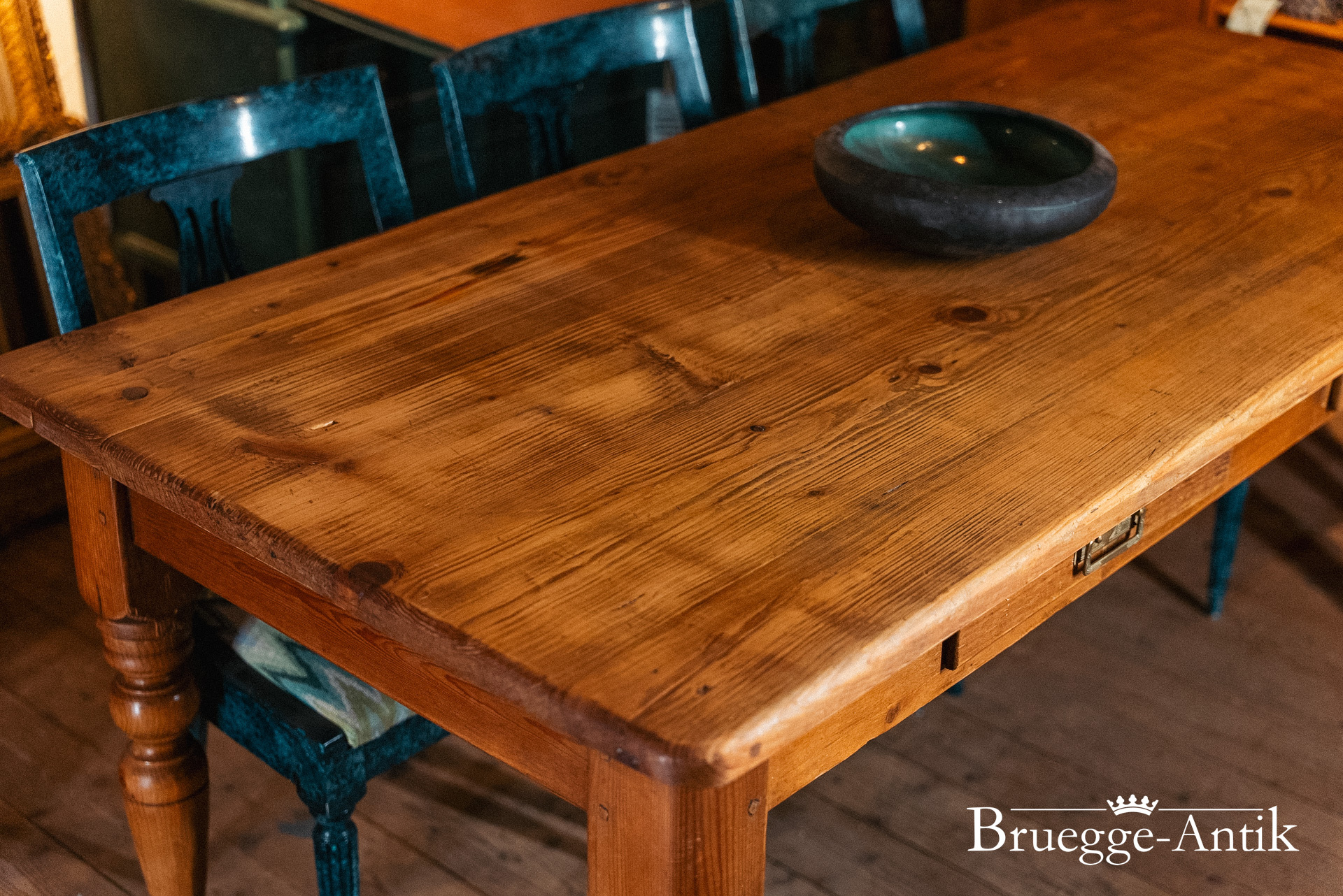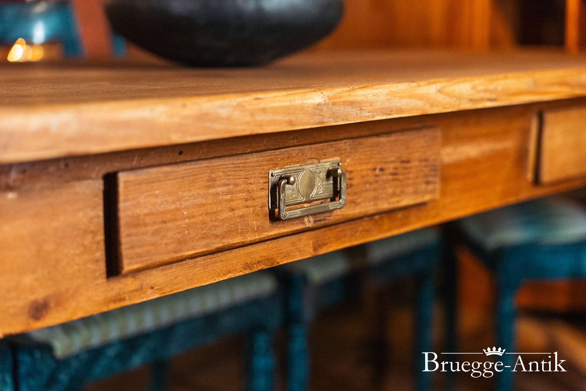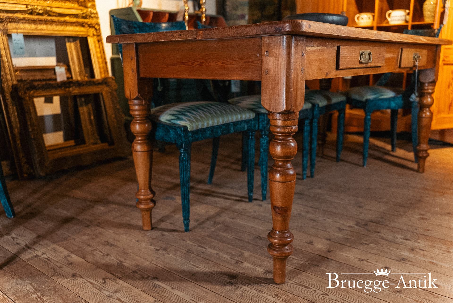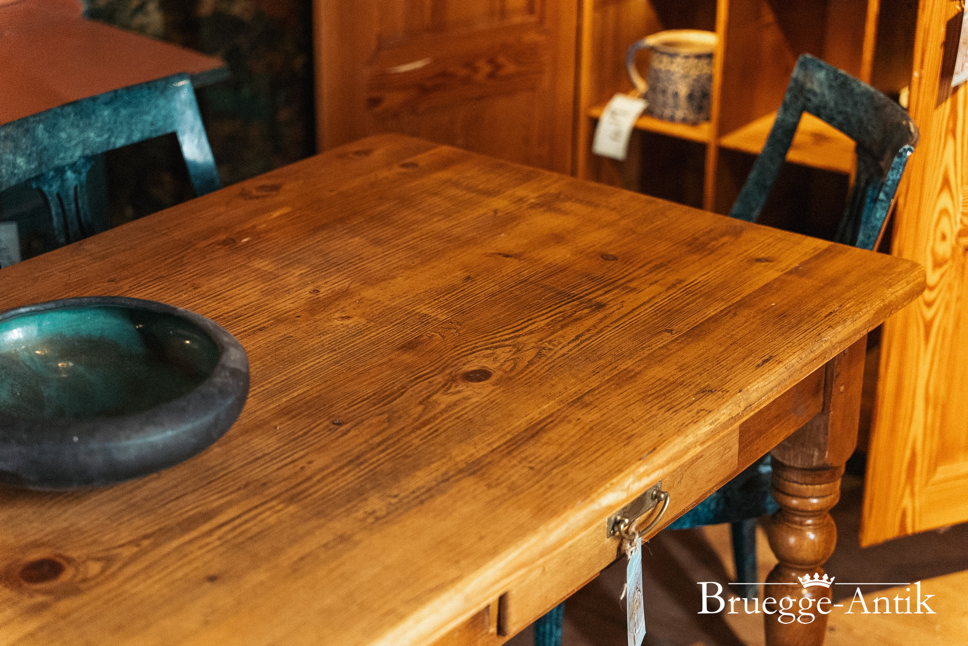 Mit seinen gedrechselten Beinen und den beiden Schubladen ein gemütlicher Tisch mit einladender Wirkung. Antiker Tisch aus Kiefernholz, Beine aus Buche, mit viel Sorgfalt ausgewähltes Holz und langsam gewachsen, bieten antike Tische eine Langlebigkeit, die wir mit Liebe erhalten wollen.