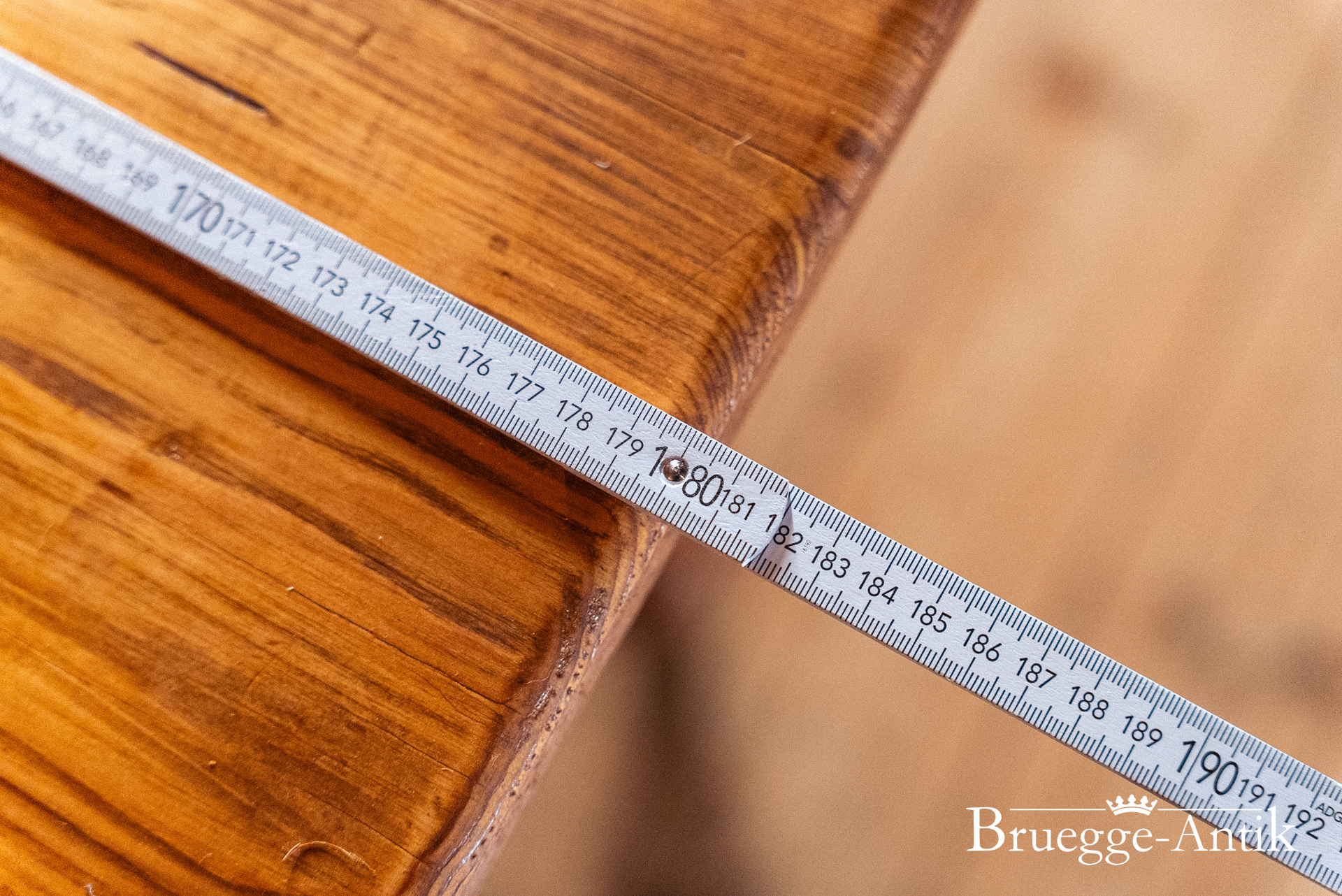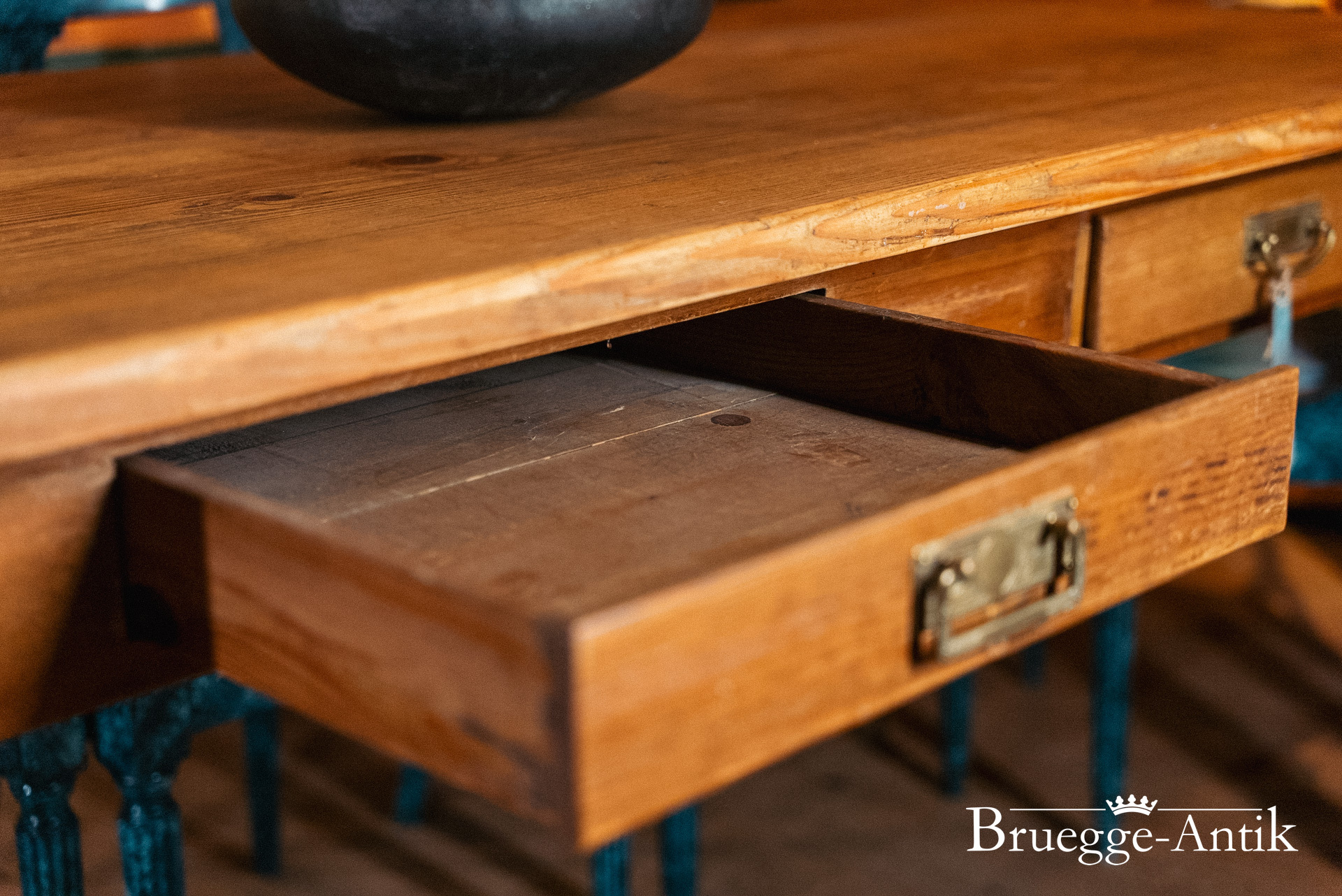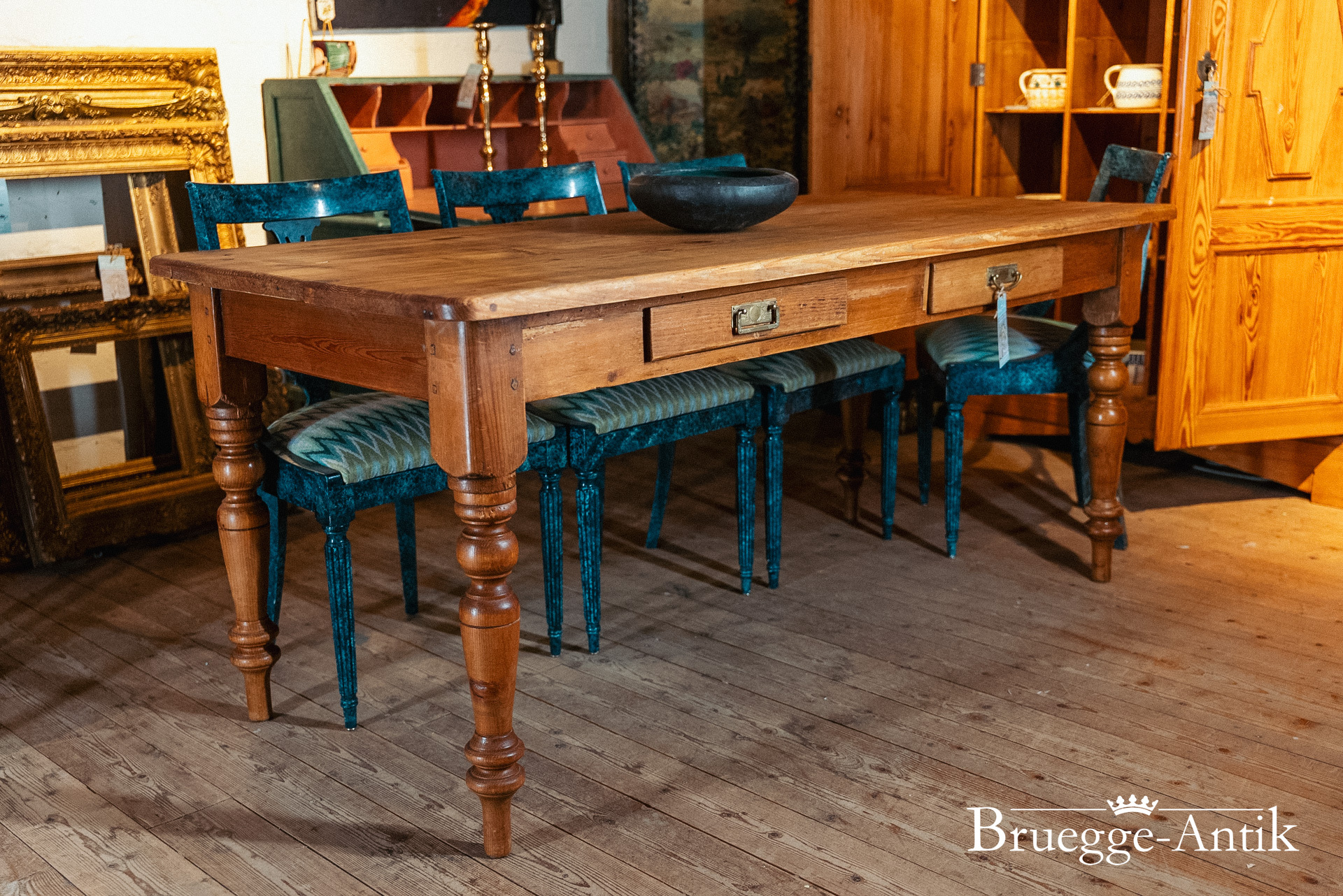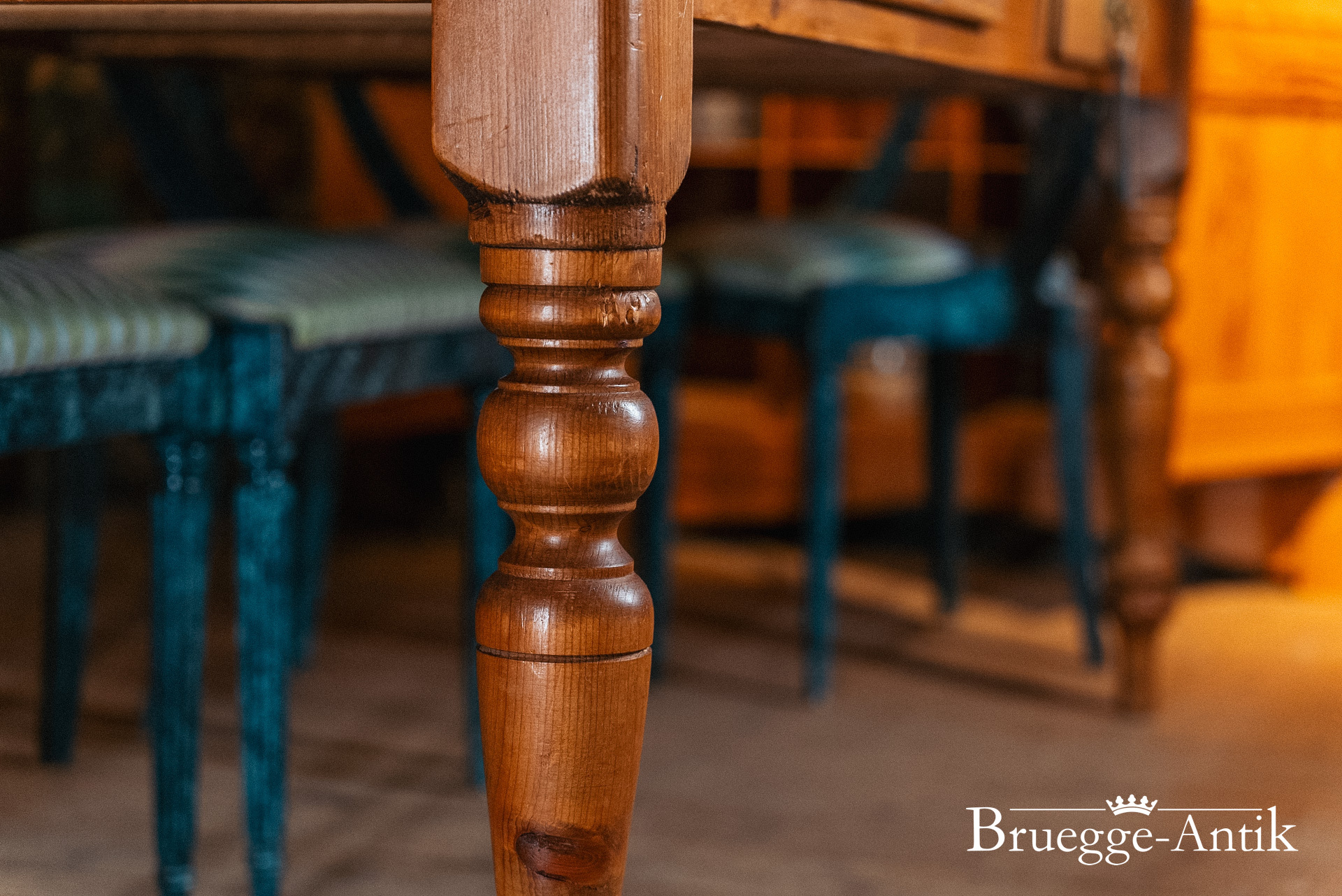 Mit seinen gedrechselten Beinen und den beiden Schubladen ein gemütlicher Tisch mit einladender Wirkung. Antiker Tisch aus Kiefernholz, Beine aus Buche, mit viel Sorgfalt ausgewähltes Holz und langsam gewachsen, bieten antike Tische eine Langlebigkeit, die wir mit Liebe erhalten wollen.