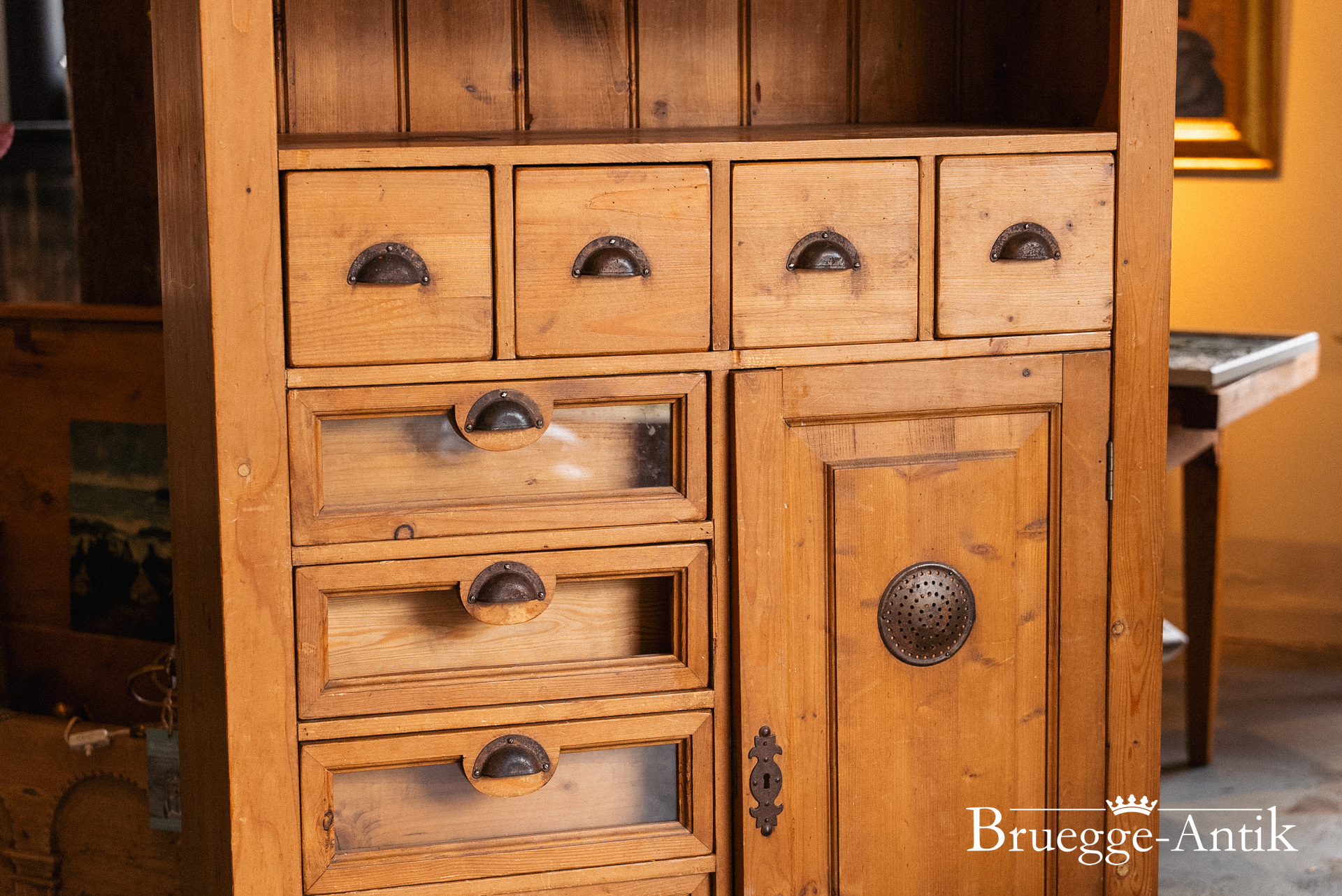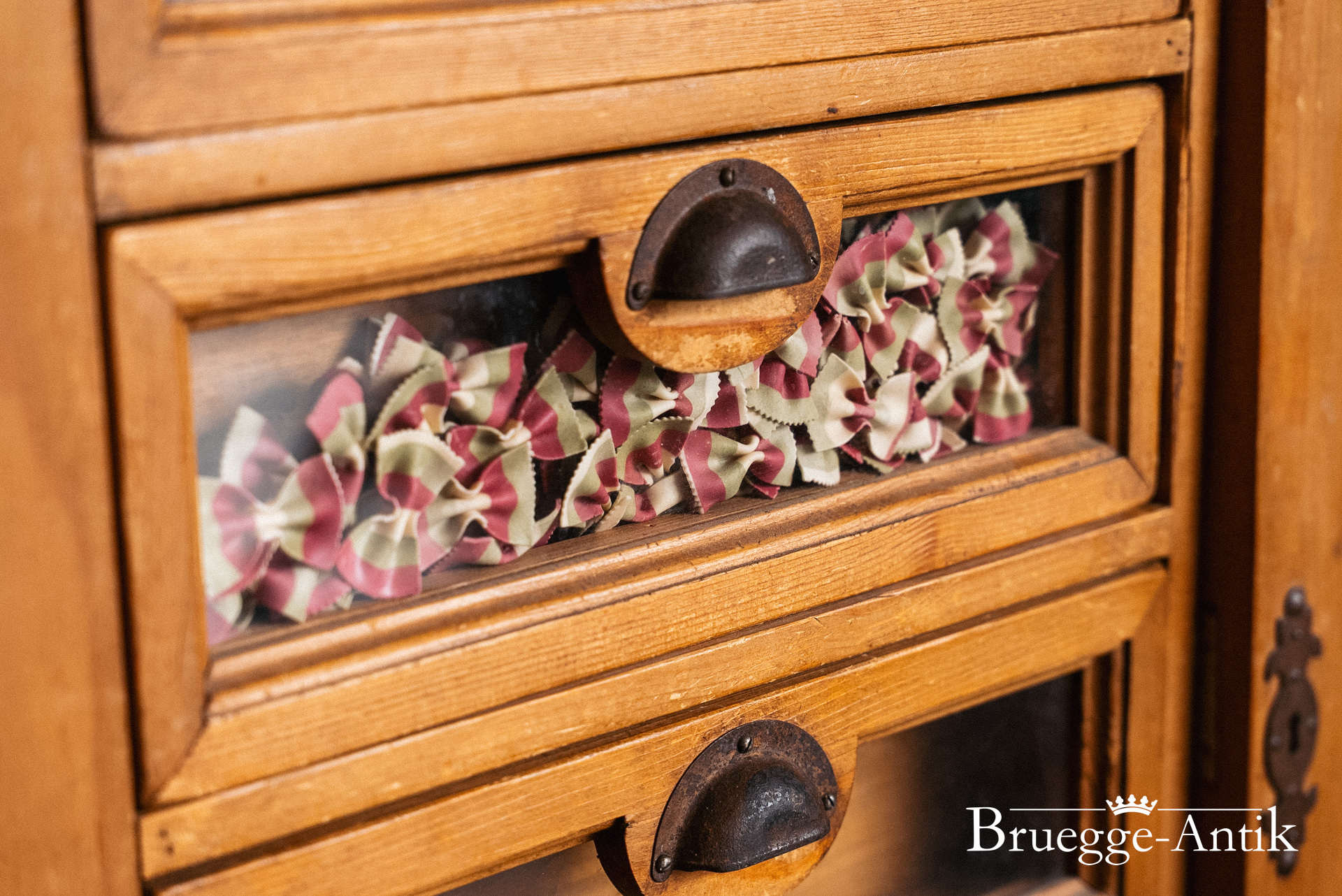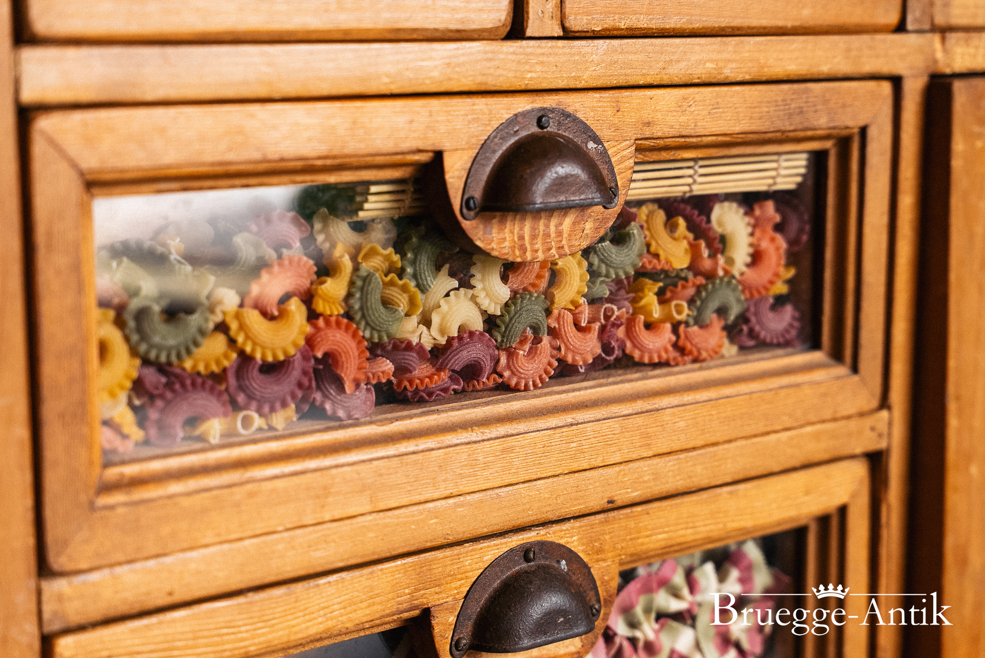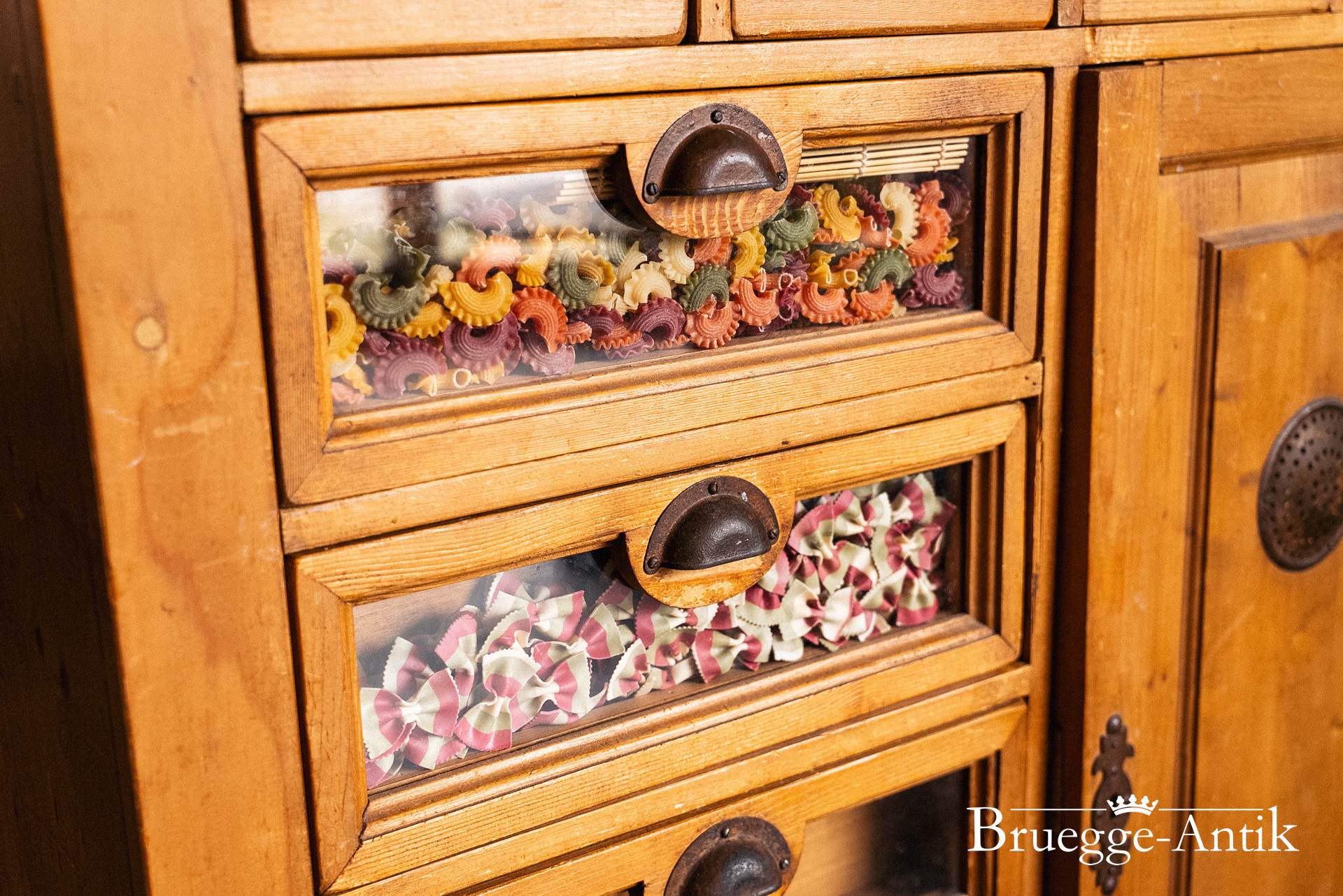 Aus dem Schrank in den Topf auf den Tisch. Nudelschränke hatten in Italien eine lange Tradition und gerieten in Vergessenheit, dabei sind sie doch kaum aus der italienischen Küche wegzudenken. Um so reizender erscheint uns dieser Vintageschrank, hinter dessen Glasscheiben sich die Nudeln zur Dekoration befinden. Wunderbares Laden- oder Küchenmöbel für die echte `Cucina Italiana ´. Reserviert!