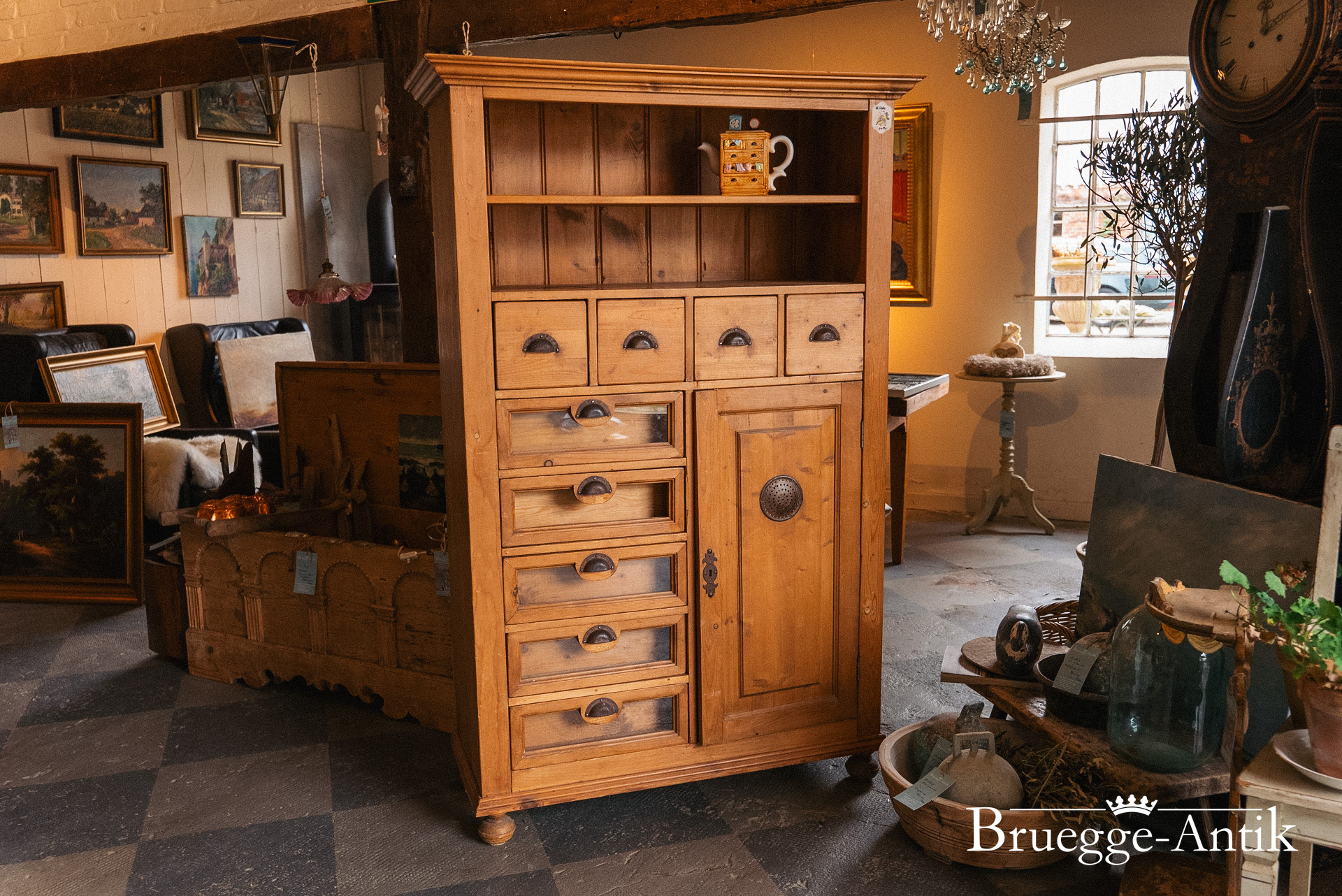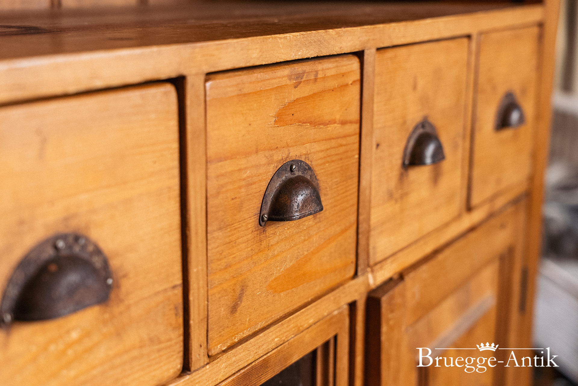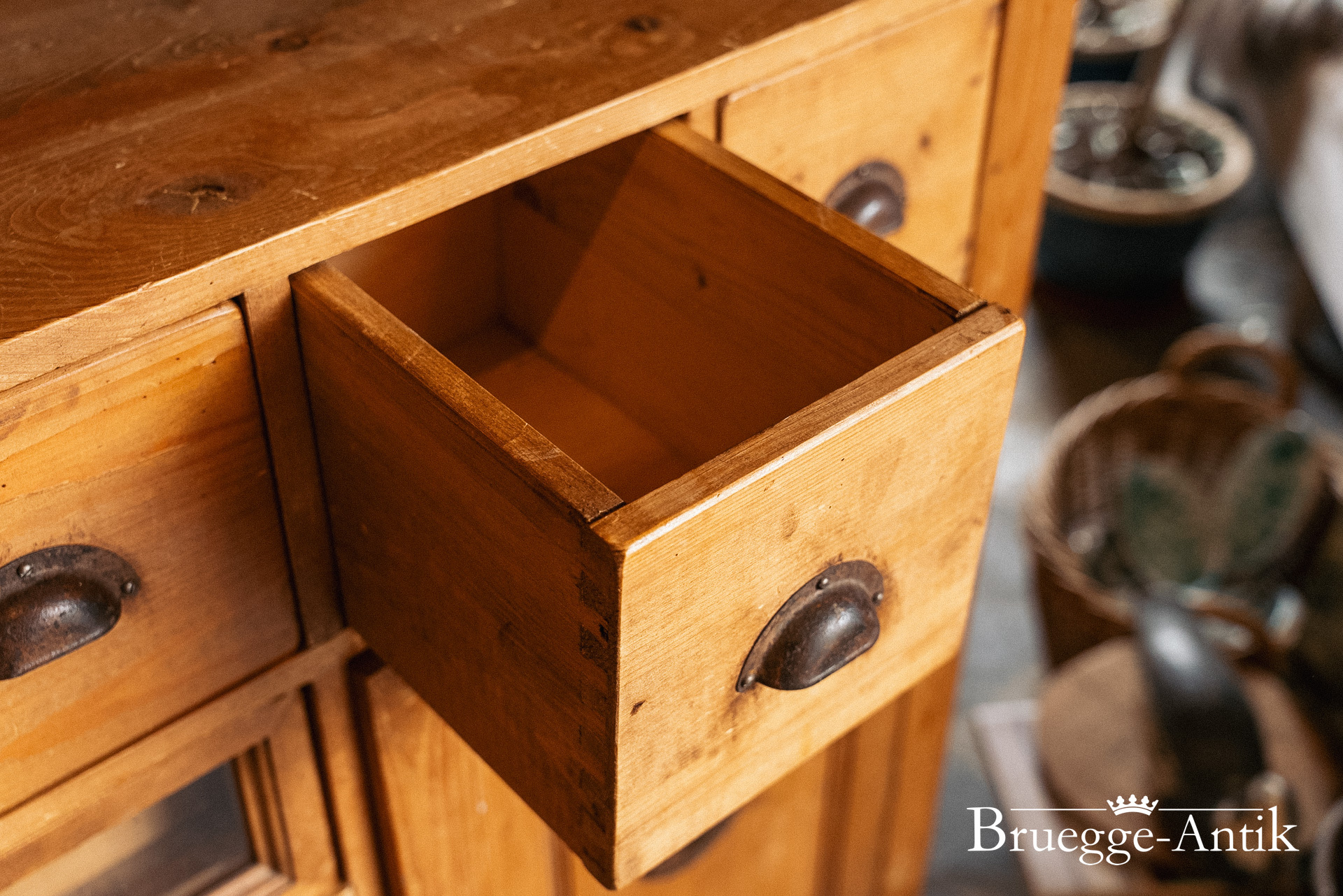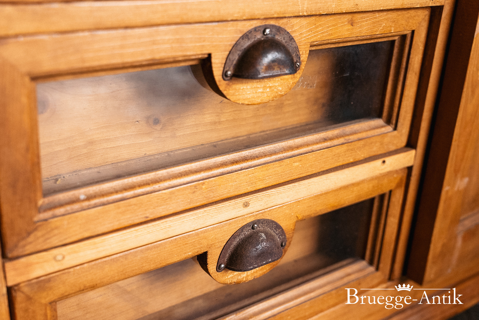 Aus dem Schrank in den Topf auf den Tisch. Nudelschränke hatten in Italien eine lange Tradition und gerieten in Vergessenheit, dabei sind sie doch kaum aus der italienischen Küche wegzudenken. Um so reizender erscheint uns dieser Vintageschrank, hinter dessen Glasscheiben sich die Nudeln zur Dekoration befinden. Wunderbares Laden- oder Küchenmöbel für die echte `Cucina Italiana ´. Reserviert!